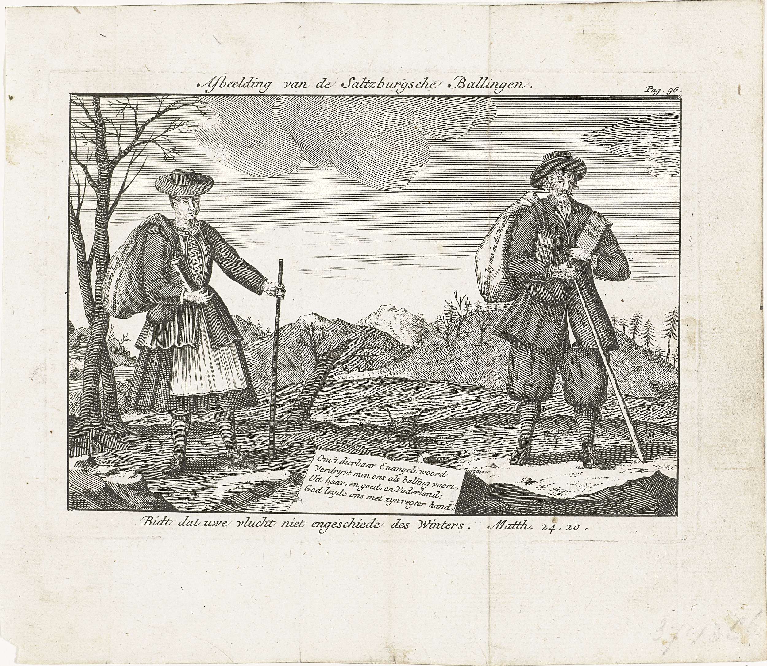 Twee Salzburgse emigranten, een man en een vrouw, om hun lutherse geloof hun land vluchtend, 1732. Gemerkt rechtsboven: Pag. 96.