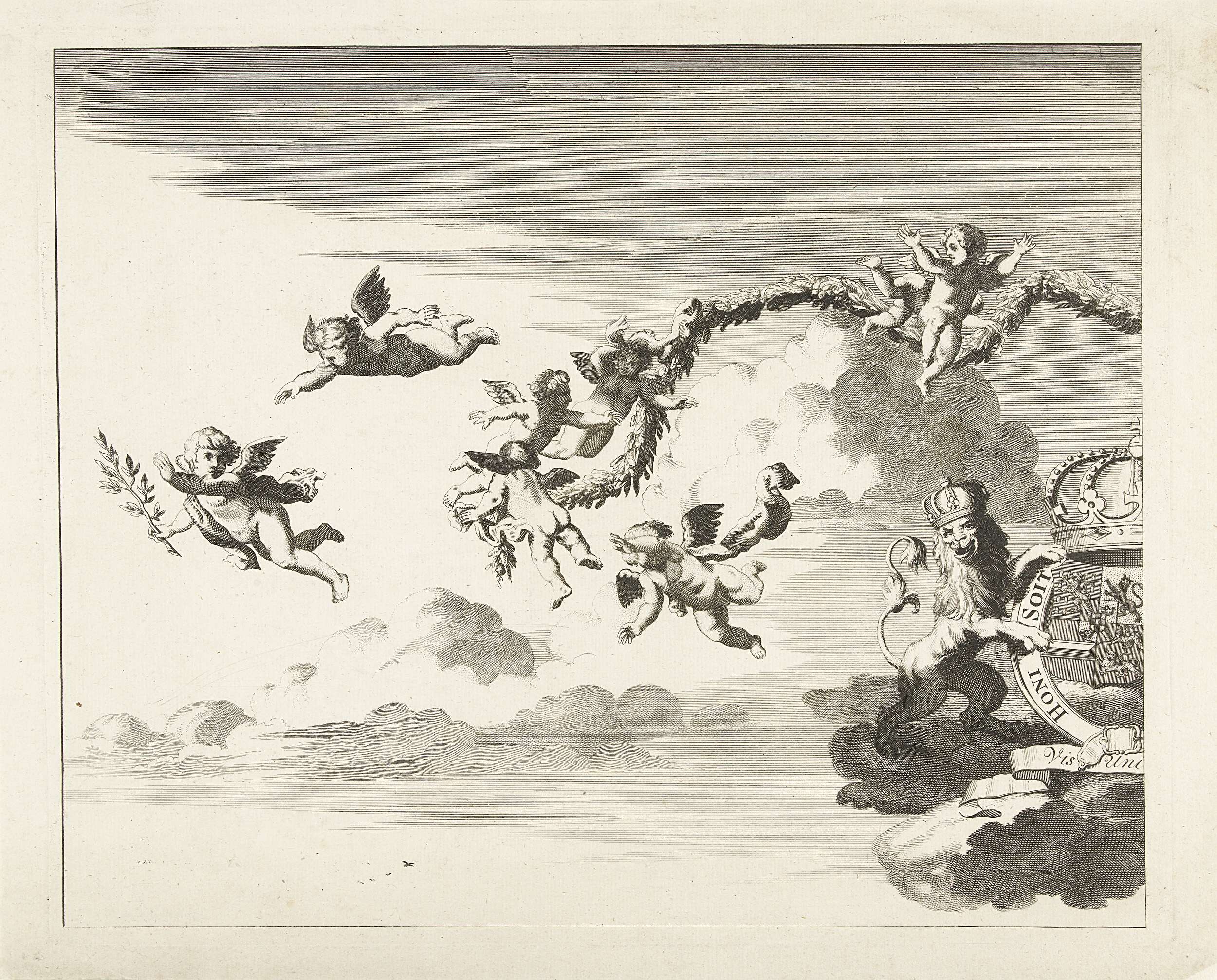 De wapens van prins Willem IV en prinses Anna van Engeland, gehuwd op 25 maart 1734, in de wolken met engeltjes met een festoen, aan de linkerzijde van het wapen de Nederlandse Leeuw als wapendrager. Ongemonteerd geheel bestaande uit twee delen waarvan dit de linkerhelft is.