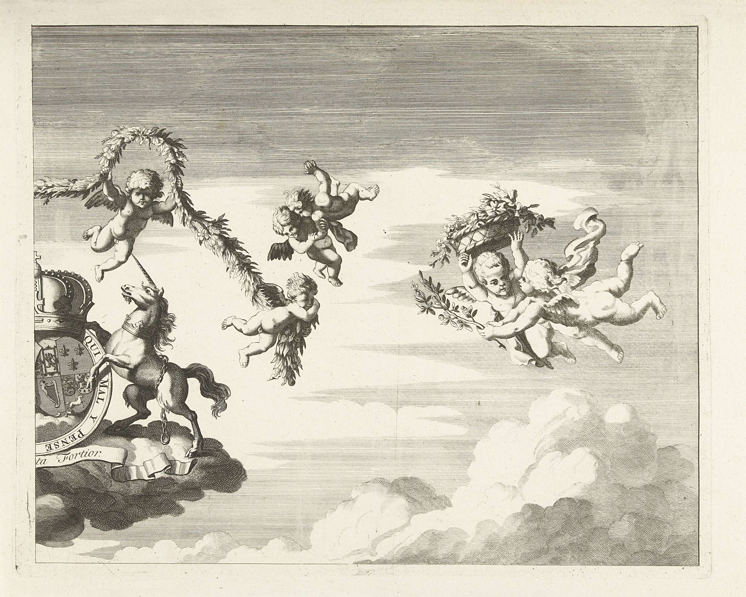 De wapens van prins Willem IV en prinses Anna van Engeland, gehuwd op 25 maart 1734, in de wolken met engeltjes met een festoen, aan de rechterzijde van het wapen de Britse eenhoorn als wapendrager. Ongemonteerd geheel bestaande uit twee delen waarvan dit de rechterhelft is.