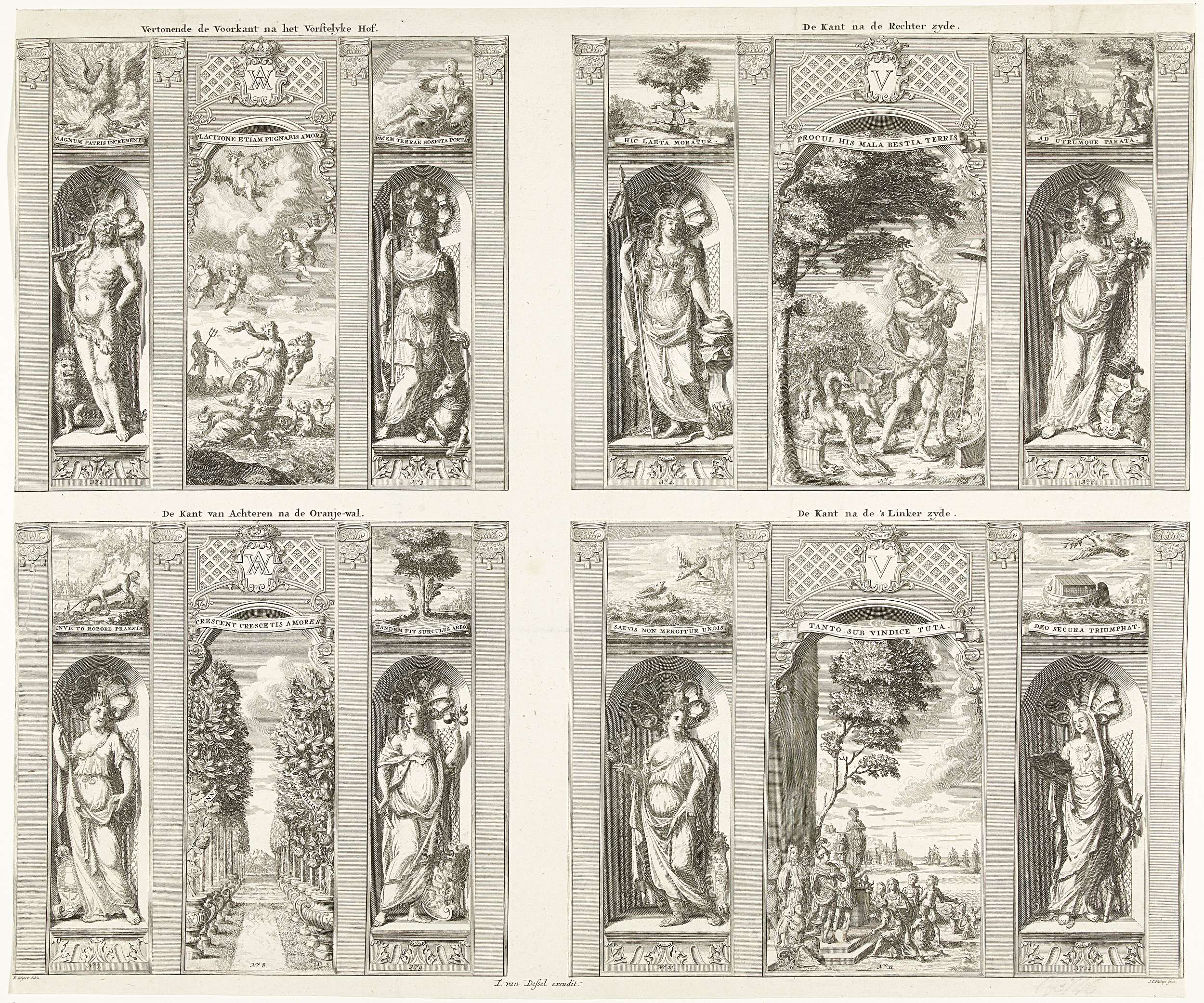 De allegorische voorstellingen aangebracht op de vier zijden van de tempel in het vuurwerk aangericht te Leeuwarden op 11 mei 1734 ter gelegenheid van de inkomst van het pasgetrouwde paar prins Willem IV en prinses Anna, gehuwd op 25 maart 1734. De scènes genummerd 1-12.