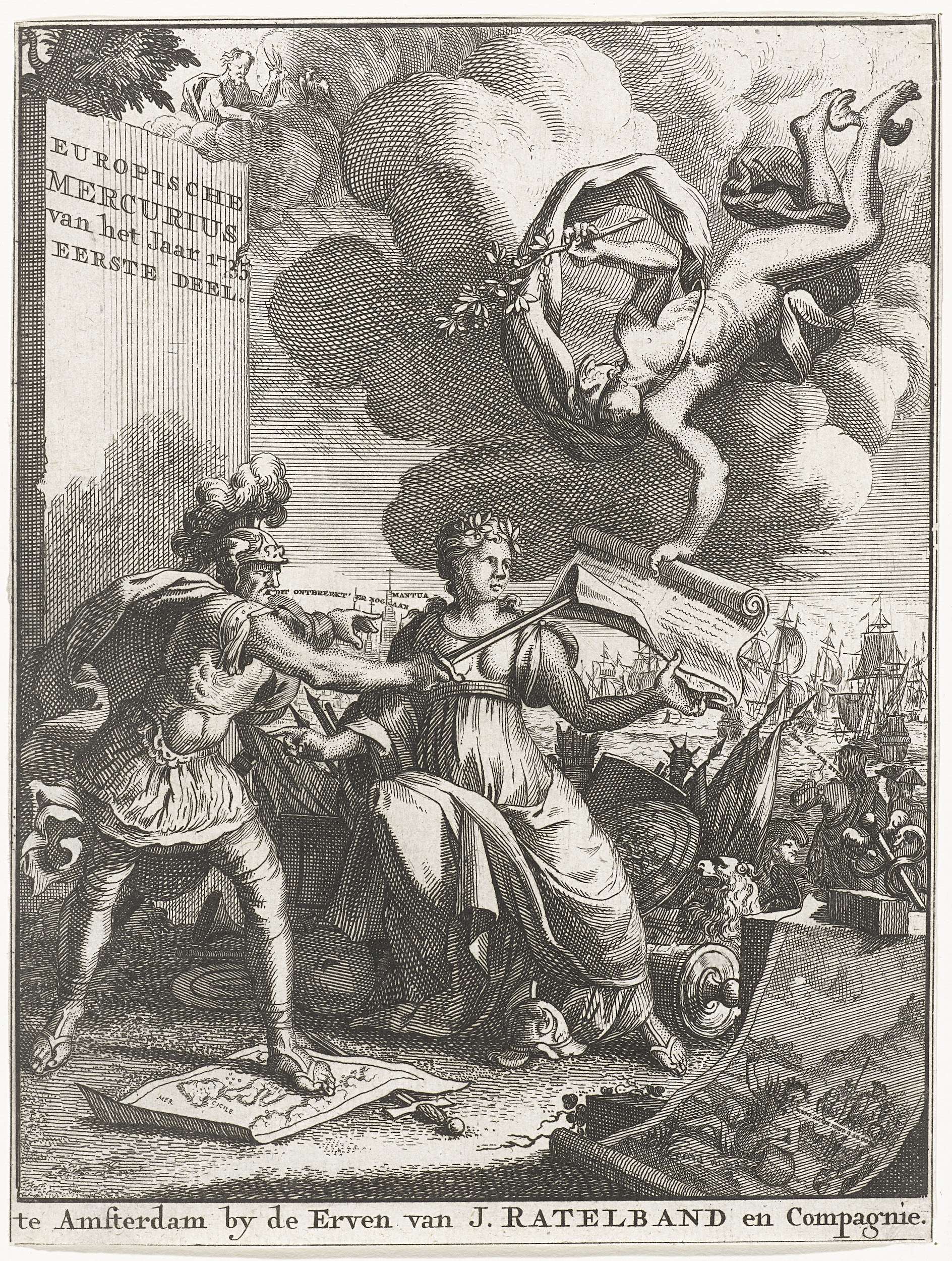 Titelpagina voor de Europische Mercurius, over het jaar 1735. Mercurius reikt de Vrede een verdrag, een soldaat vertreedt onder de voet een kaart van Italië en steekt met zijn zwaard naar het document. Op de achtergrond een zeeslag en de stad Mantua.