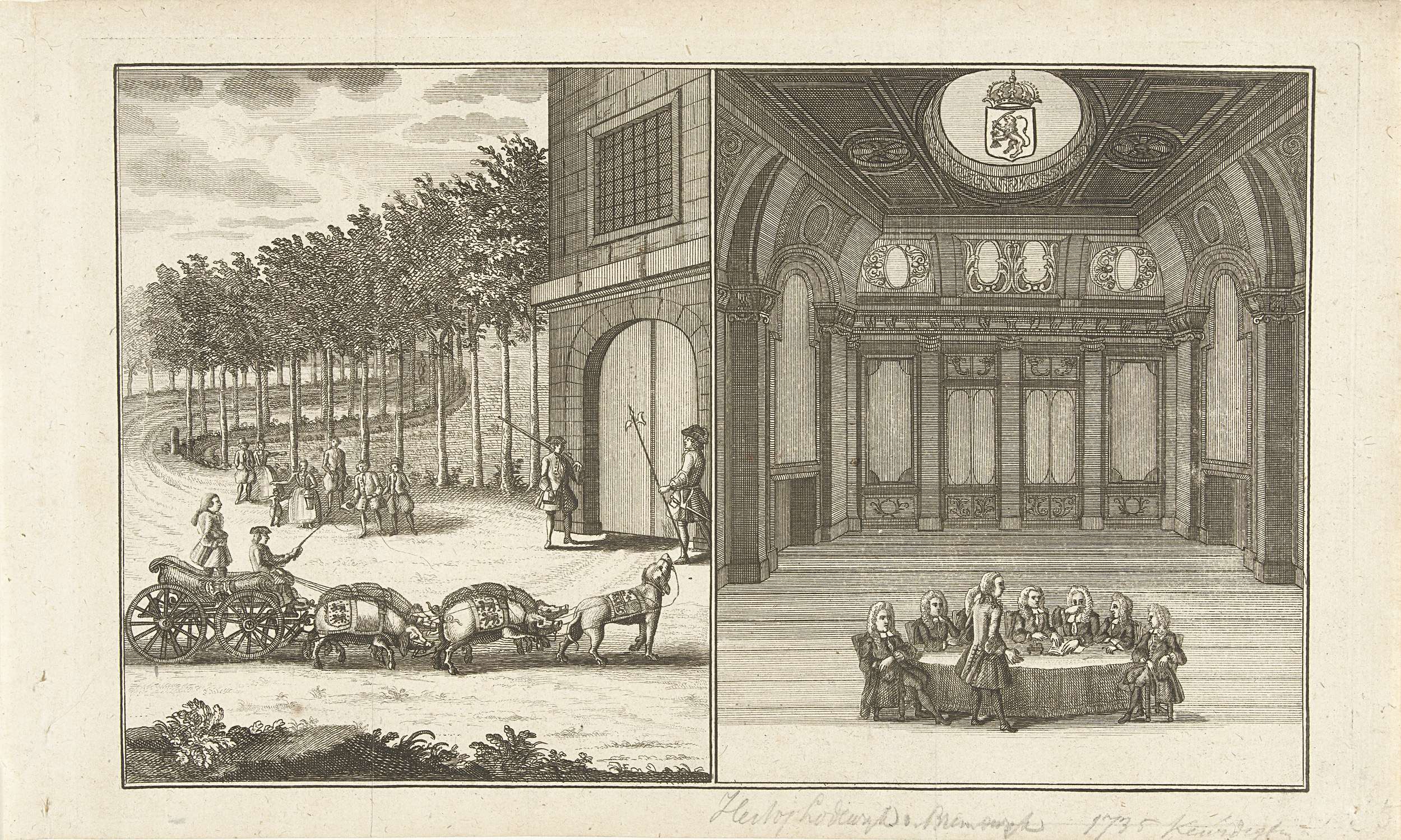 Spotprent op de pogingen van prins Willem IV om stadhouder van de gehele Republiek te worden, 1735. Voorstelling in twee delen. Links de rijtuig van de prins getrokken door varkens (met dekkleden met het wapen van Friesland) en een Engelse dog, rechts bepleit de prins zijn zaak staande voor een vergadertafel. Bij de prent behoort ...
