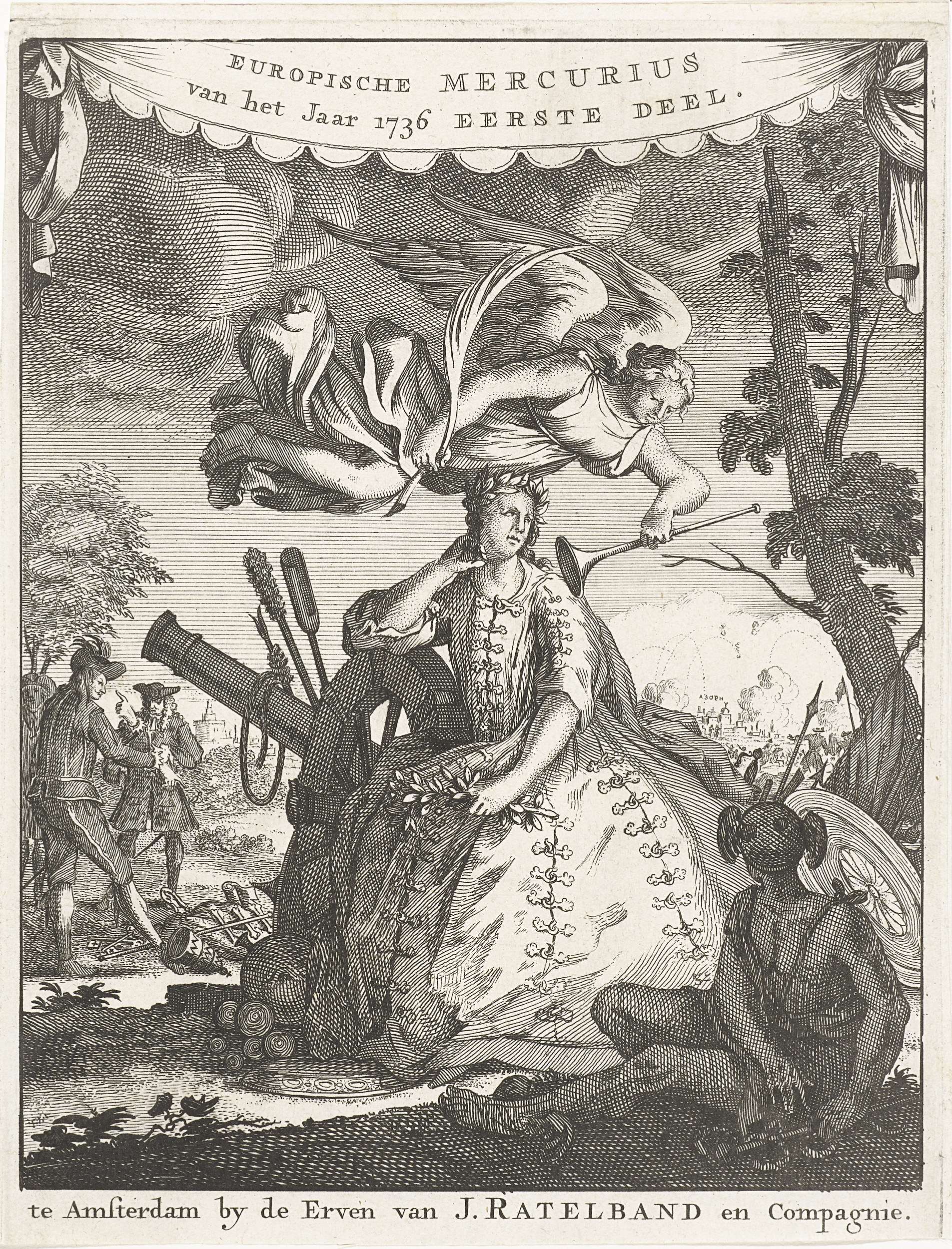 Titelpagina voor de Europische Mercurius, over het jaar 1736. De Vrede zittend bij een kanon, in de lucht de Faam, op de achtergrond een oorlogstafereel.
