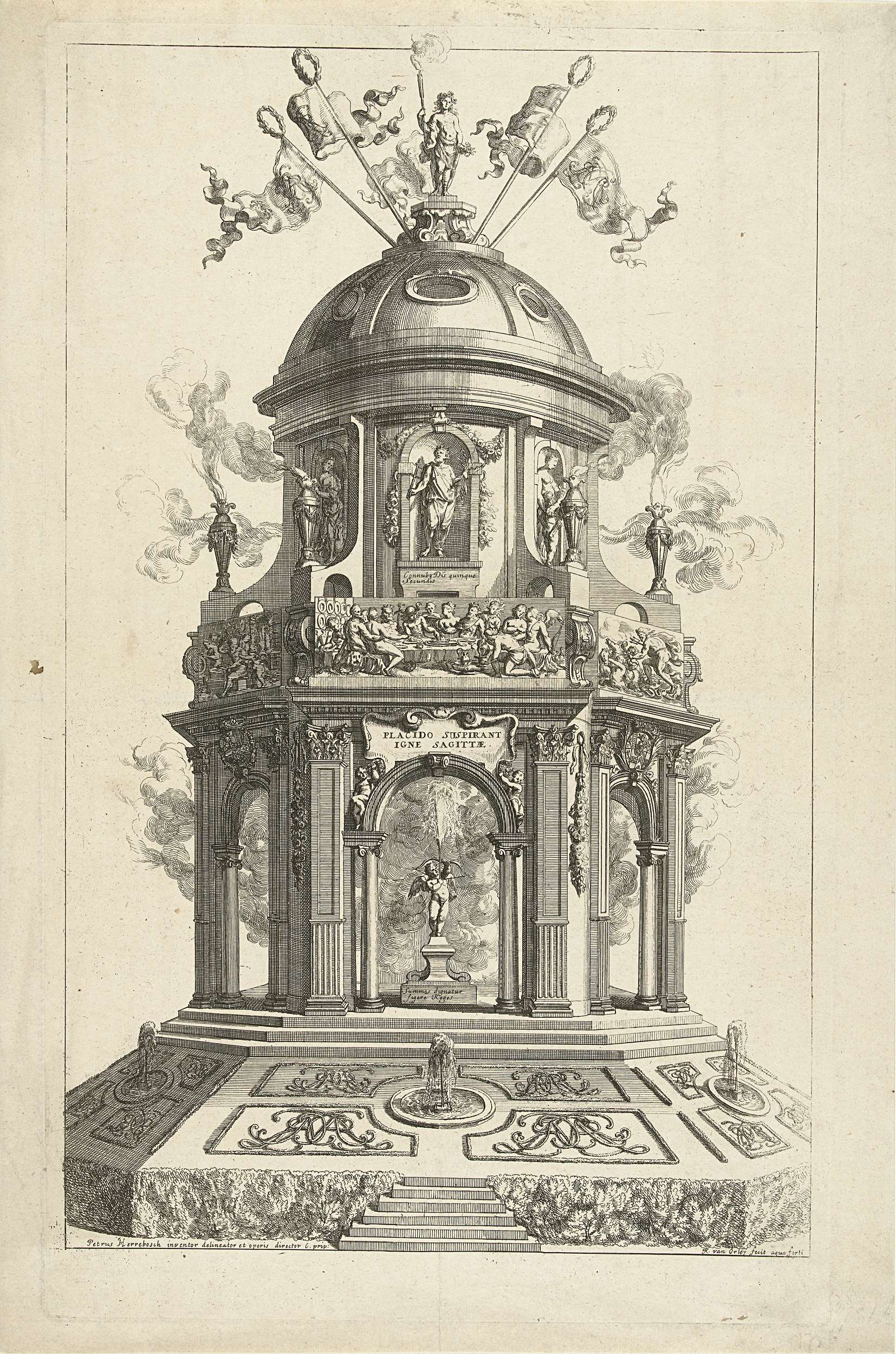 Erepoort of tempel met vreugdevuren en vuurwerk ter gelegenheid van het huwelijk tussen Maria Theresia van Oostenrijk en Frans Stefanus, 12 februari 1736. In de onderdoorgang een Amor die een vuurpijl afschiet. De tempel versierd met allegorisch en mythologische scènes en beelden.
