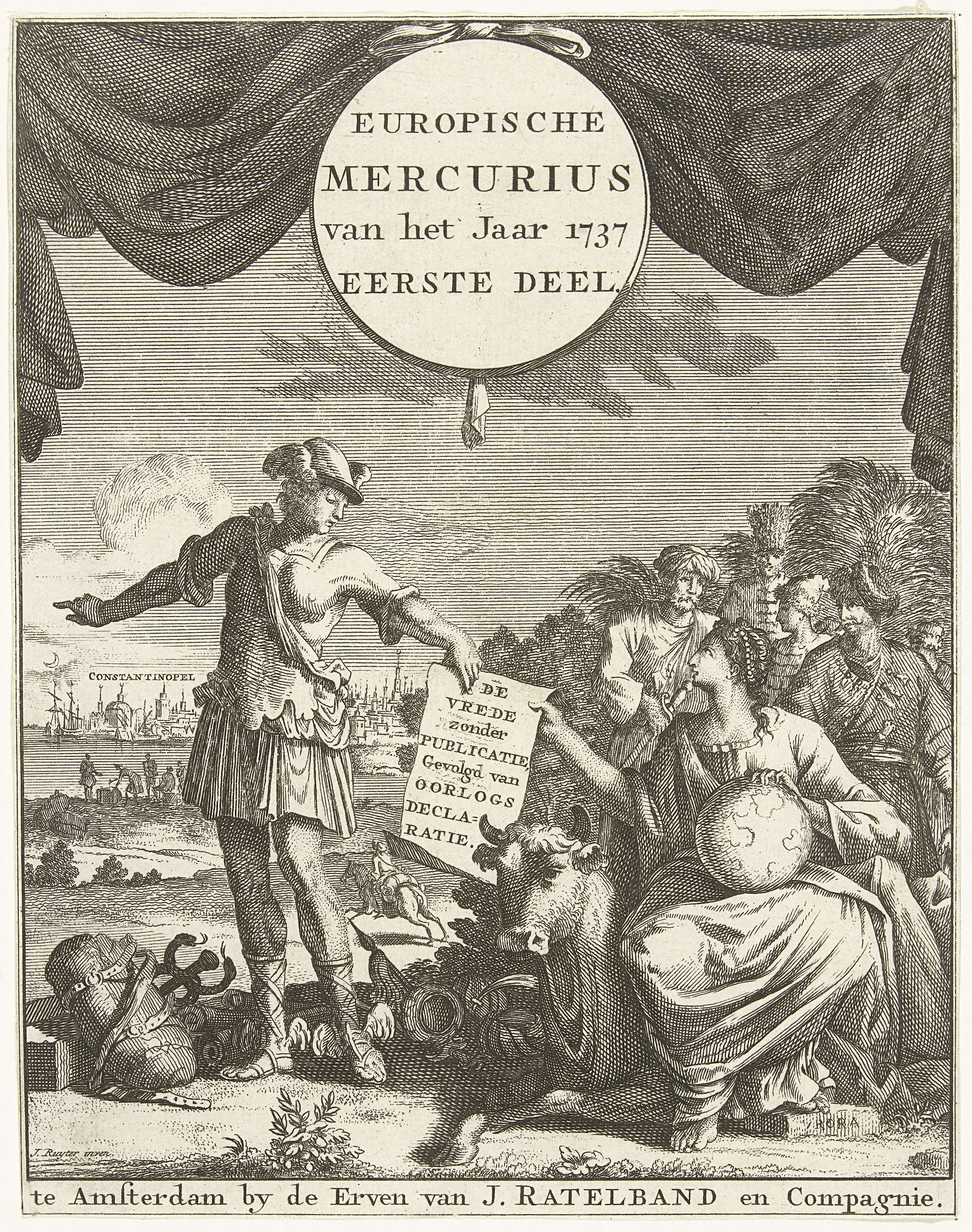 Titelpagina voor de Europische Mercurius, over het jaar 1737. Mercurius reikt Europa een blad over oorlog en vrede, op de achtergrond Constantinopel.