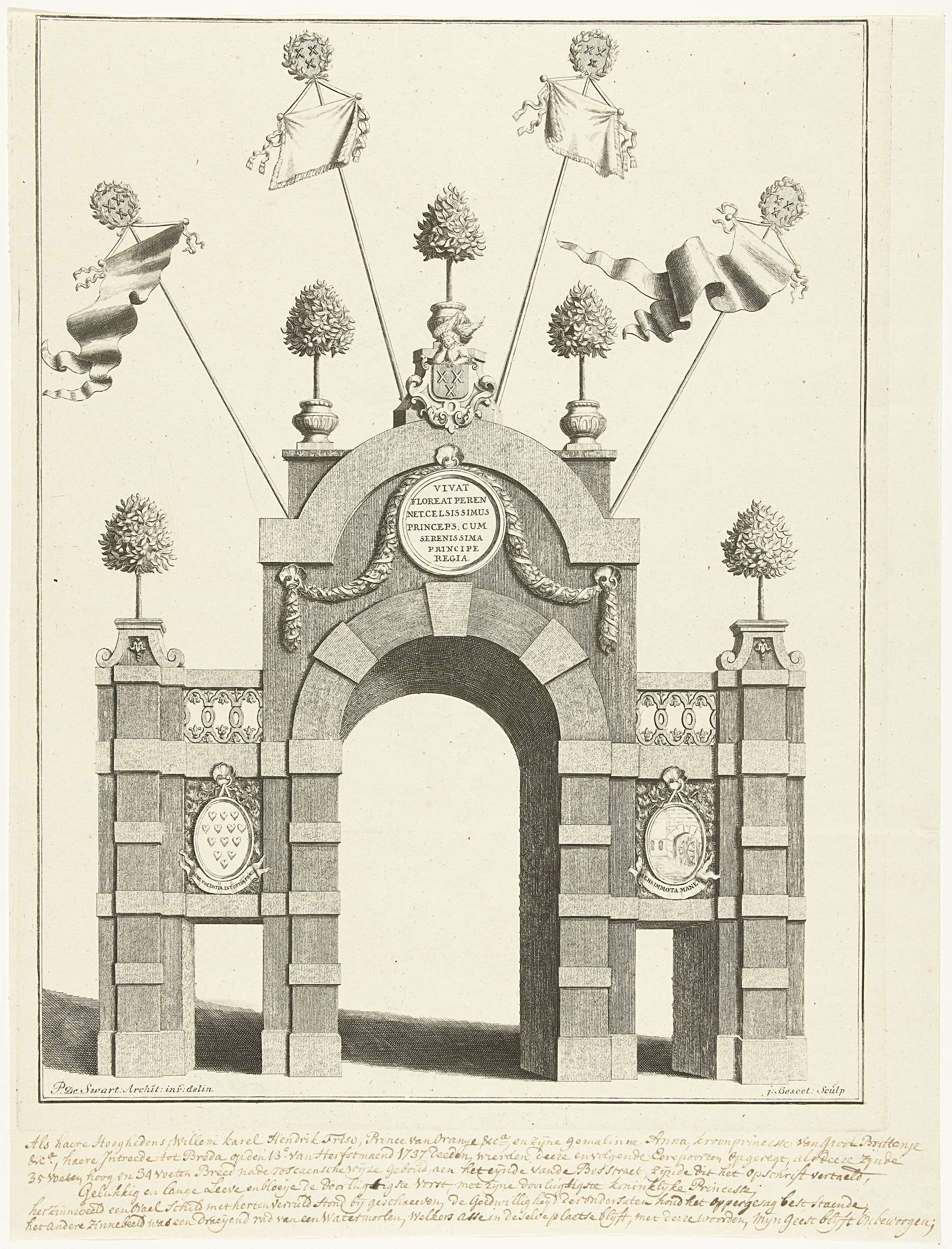 Triomfpoort opgericht in de Bosstraat bij de intrede van Willem IV en zijn gemalin Anna van Hannover te Breda op 13 september 1737. De erepoort versierd met emblemen, spreuken en vaandels. In de ondermarge een handgeschreven opschrift in pen in bruin met een beschrijving van de poort.