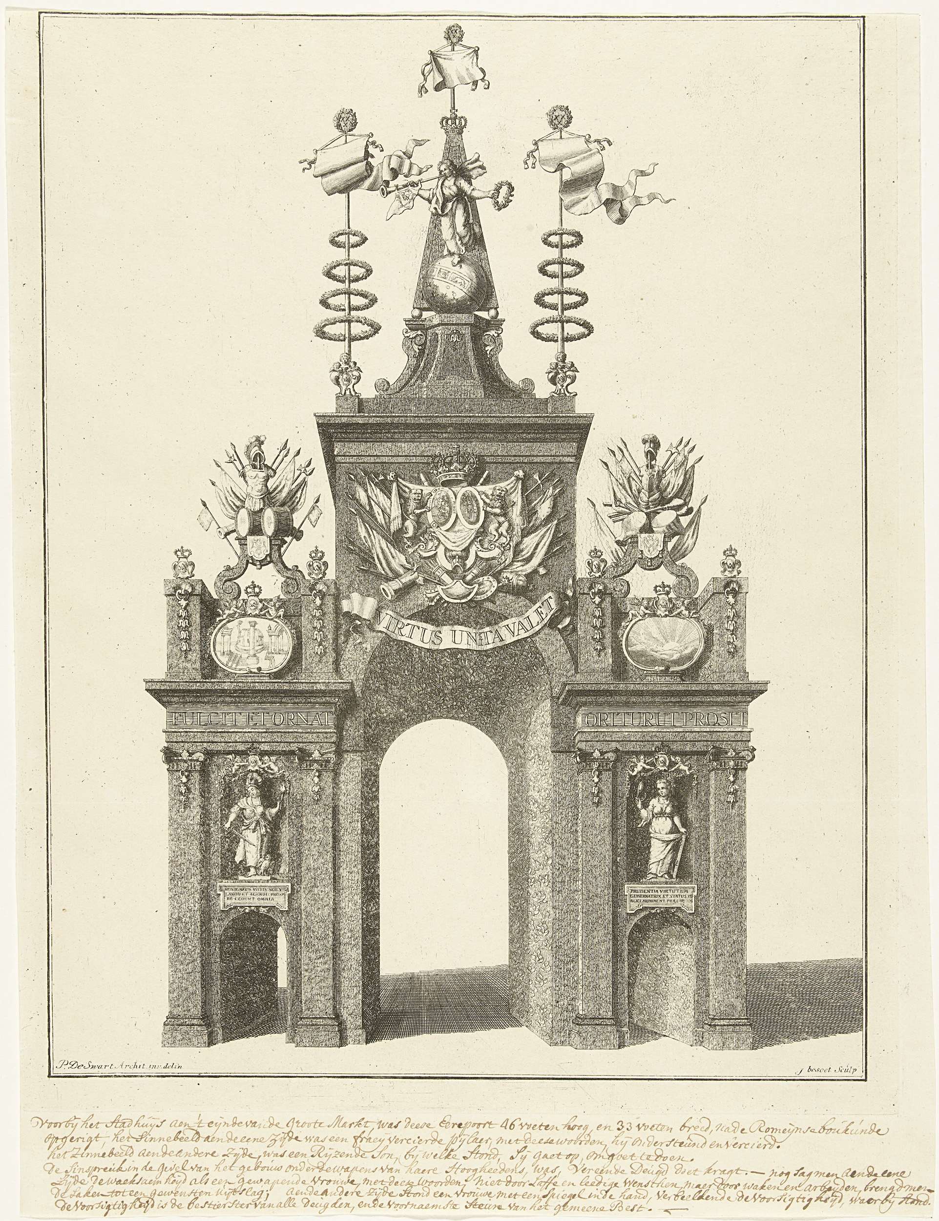 Ereboog opgericht op de Grote Markt bij de intrede van Willem IV en zijn gemalin Anna van Hannover te Breda op 13 september 1737. De boog versierd met standbeelden, wapentrofeeën en wapens. In de ondermarge een handgeschreven opschrift in pen in bruin met een beschrijving van de poort.