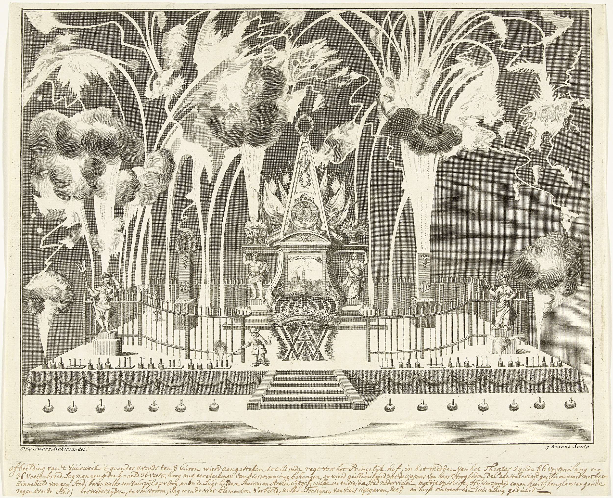 Vuurwerk afgestoken voor het Prinsenhof bij de intrede van Willem IV en zijn gemalin Anna van Hannover te Breda op 13 september 1737. Bij de toegangshek een monogram met de letters WA. In de ondermarge een handgeschreven opschrift in pen in bruin met een beschrijving van de poort.