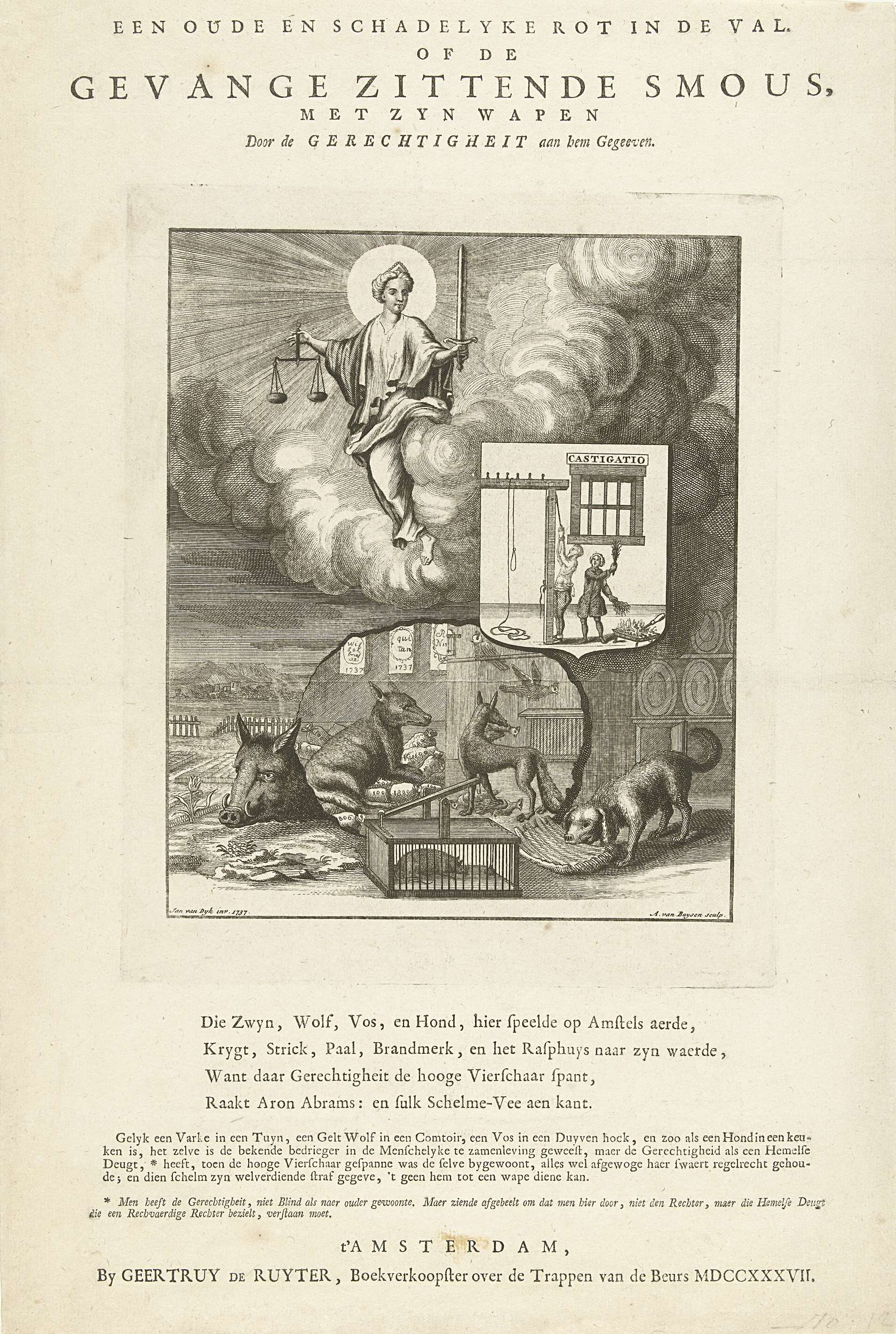 De Amsterdamse bedrieger Aron Abrams of Abrahams wordt gegeseld en gebrandmerkt. In de wolken Justitia met zwaard en weegschaal, maar zonder blinddoek. Onder vier dieren die symbool staan voor 'de slechte Jood' - een wroetend zwijn, een wolf in een bankkluis, een vos in een duiventil en een hond in de keuken. De rat in ...