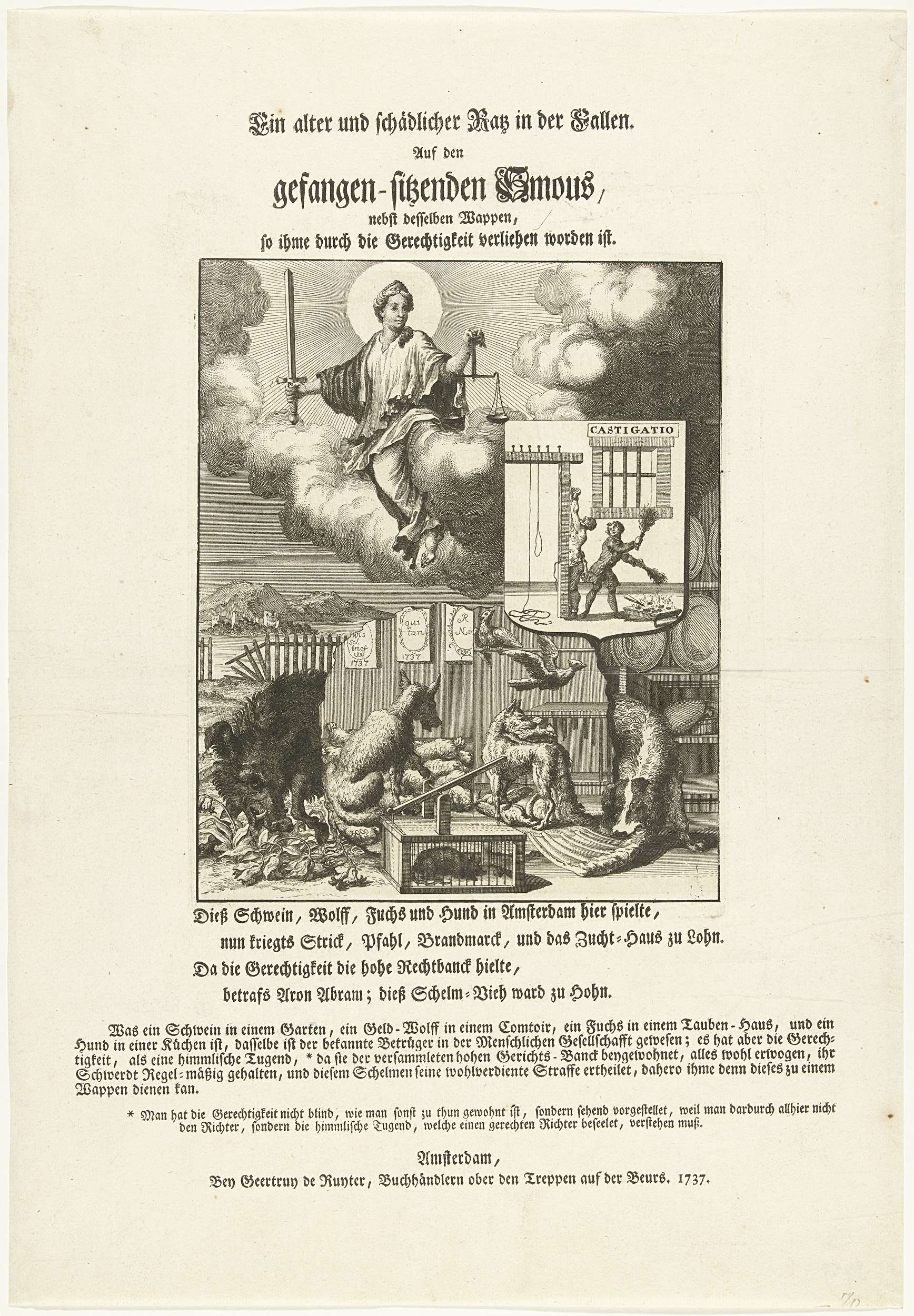 De Amsterdamse joodse bedrieger Aron Abrams of Abrahams wordt gegeseld en gebrandmerkt. In de wolken Justitia met zwaard en weegschaal maar zonder blinddoek. Onder vier dieren die symbool staan voor 'de slechte Jood': een wroetend zwijn, een wolf in een bankkluis, een vos in een duiventil en een hond in de keuken. De rat in ...