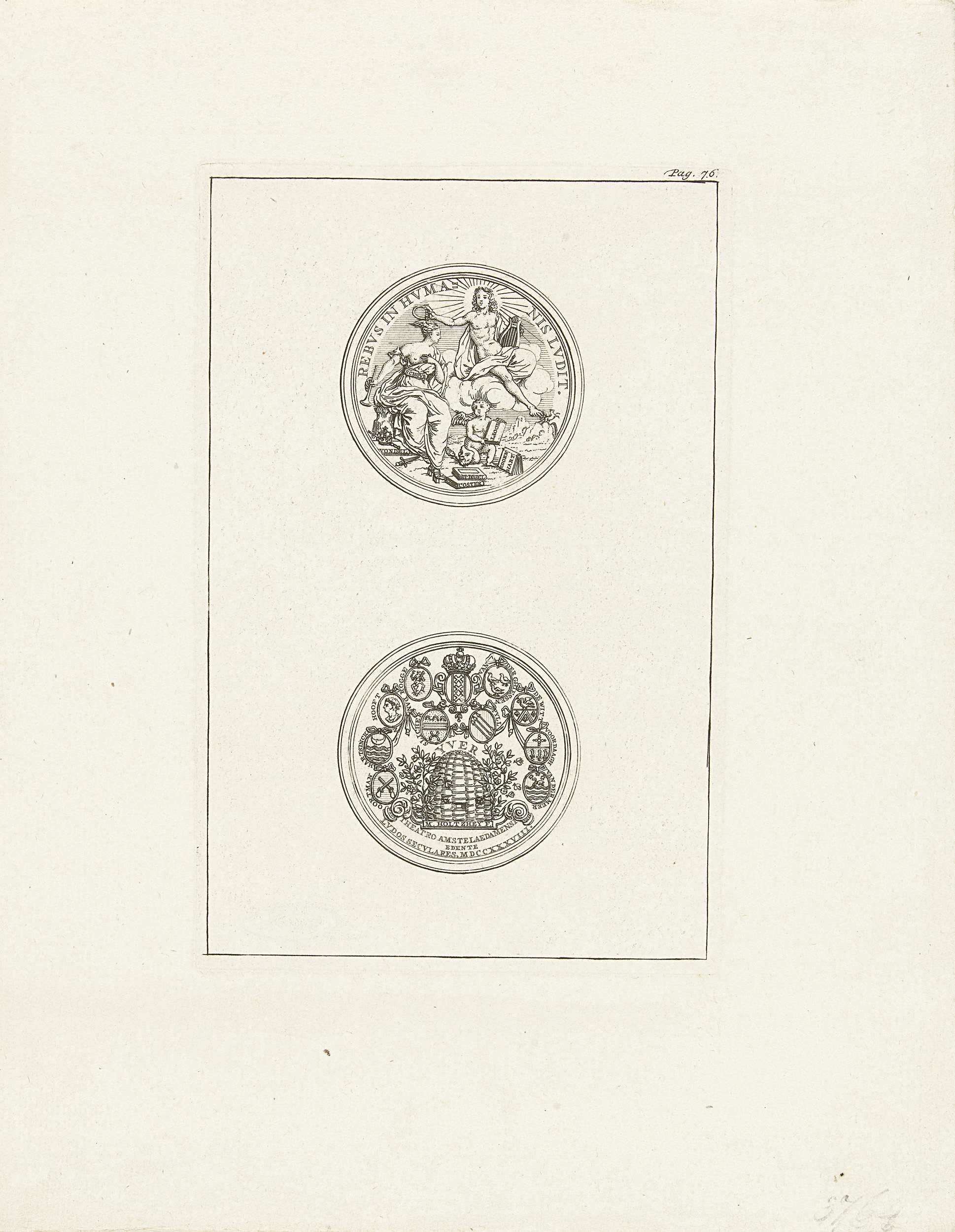 De beide zijden van een penning geslagen ter ere van het eerste eeuwfeest van de Amsterdamse Schouwburg, 1738. Gemerkt rechtsboven: Pag. 76.
