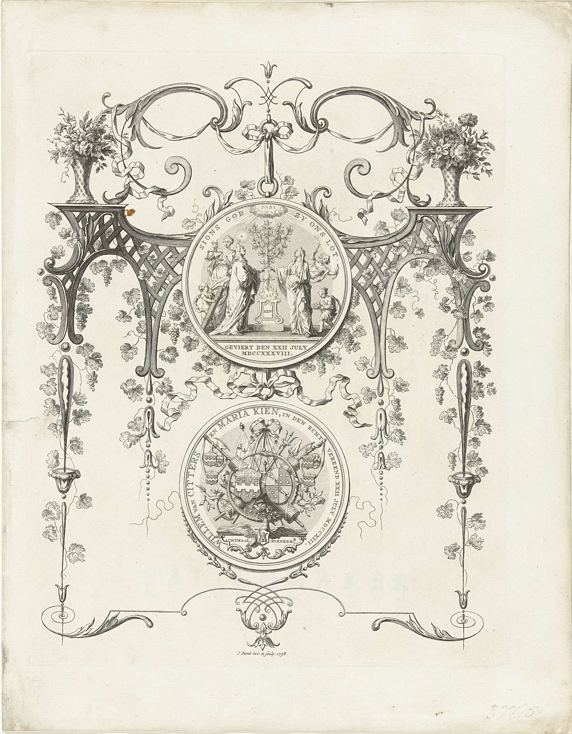 Decoratieve voorstelling met de huwelijkspenning bij het vijfentwintigjarig huwelijk in 1738 van Willem van Citters, bewindhebber van de VOC voor de kamer van Zeeland, twaalf maal burgemeester van Middelburg en Maria Kien, gehuwd op 22 juli 1713.