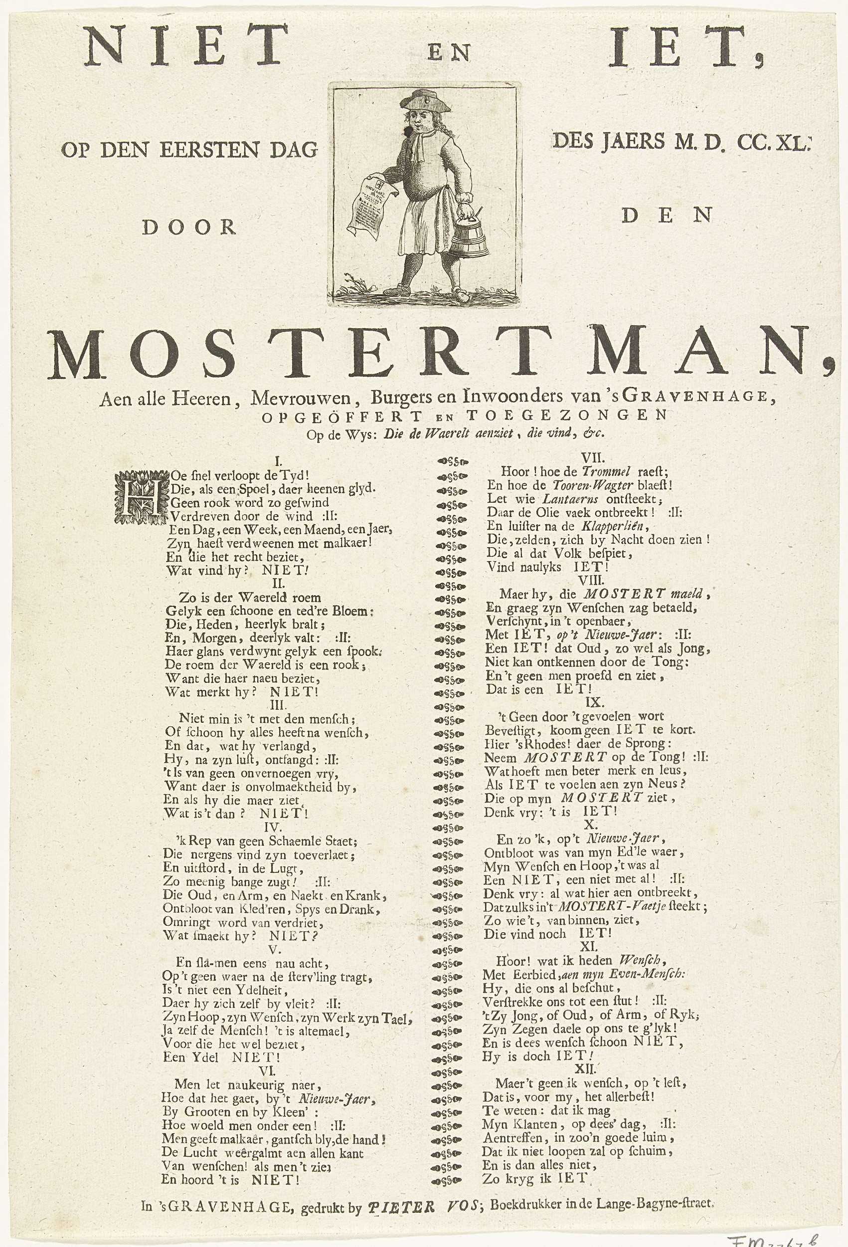 Nieuwjaarswens voor het jaar 1740 van de Mosterdman aan alle inwoners van Den Haag. Bovenaan een plaatje van een mosterdman met zijn vaatje en een nieuwjaarszang in de hand. Op het blad onder de plaat een lied in twaalf verzen in twee kolommen.