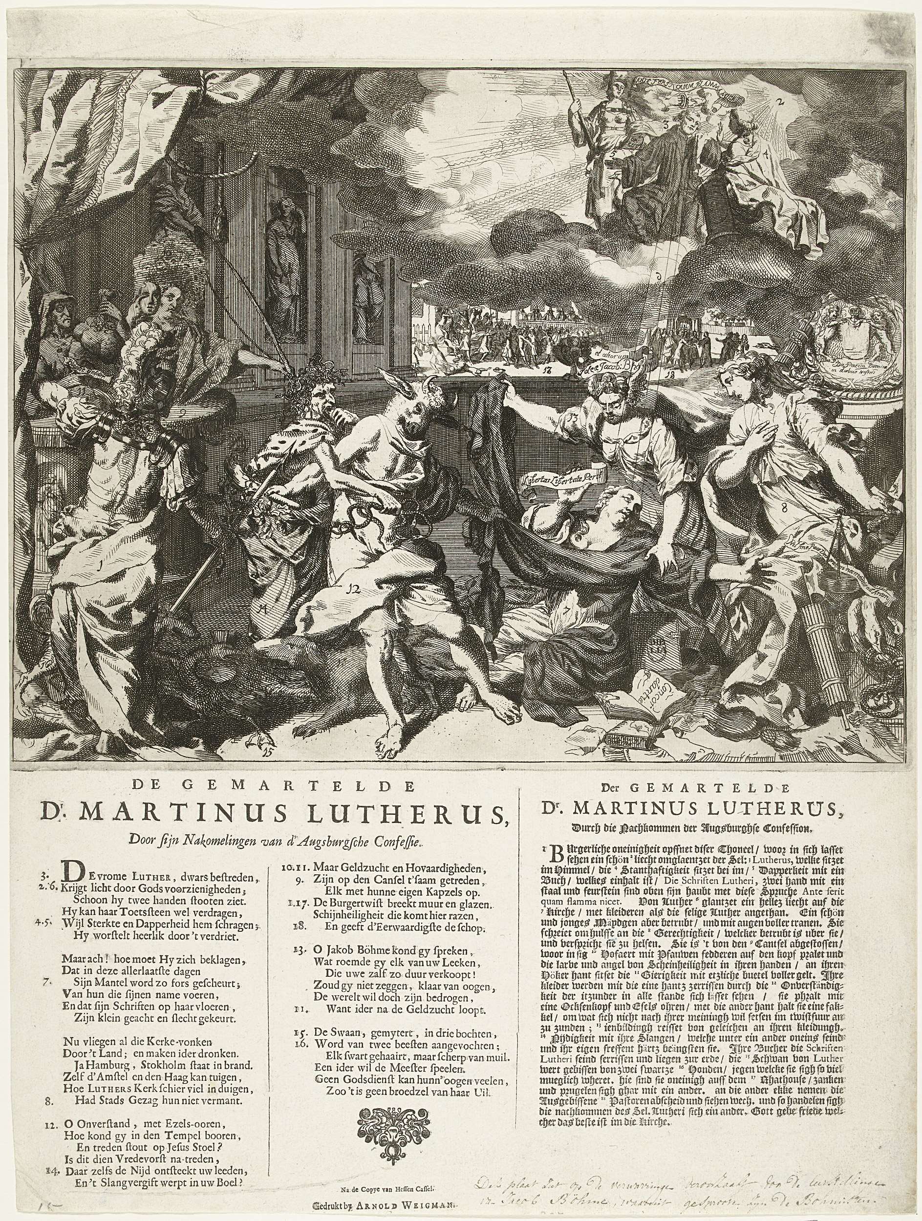 Allegorie op de twisten in de Lutherse gemeente te Den Haag tussen de predikanten Mauritius Maassen en J.G. Pambo, 1739. De Lutherse Kerkmaagd ligt op de grond en haar kleren worden verscheurd door Onverstand, links Hoogmoed en Hebzucht op de kansel, rechts Stedelijk Gezag en de geest van Jacob Böhme. Vanuit de wolken kijkt Martin ...