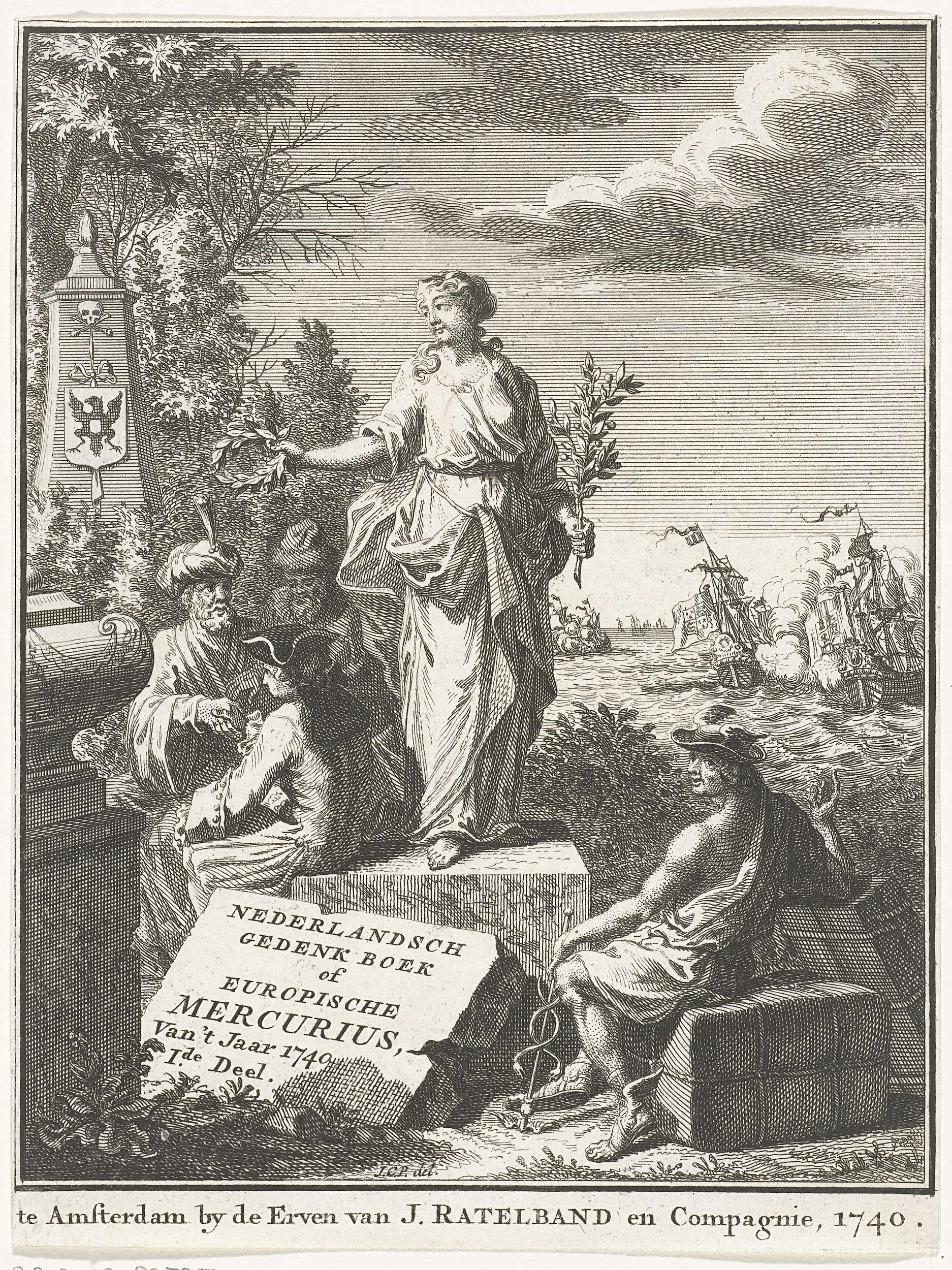 Titelpagina voor de Europische Mercurius, over het jaar 1740. De Vrede staande op een voetstuk, links schudden een Europeaan en een Turk elkaar de hand, op de voorgrond Mercurius zittend tussen enkele grote pakketten, in de verte een zeeslag.