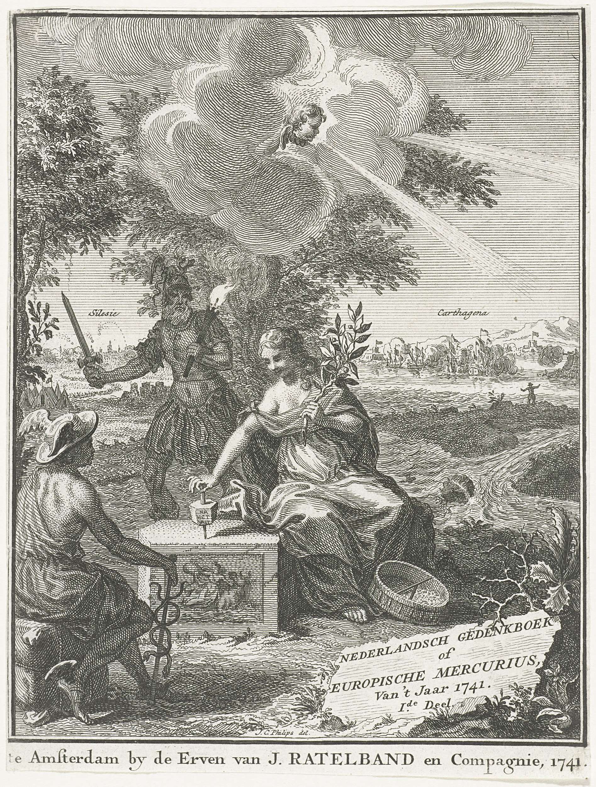 Titelpagina voor de Europische Mercurius, over het jaar 1741. De Vrede speelt met een draaitol, op de achtergrond Mars met zwaard en fakkel, in de verte Silezië en Carthagena.