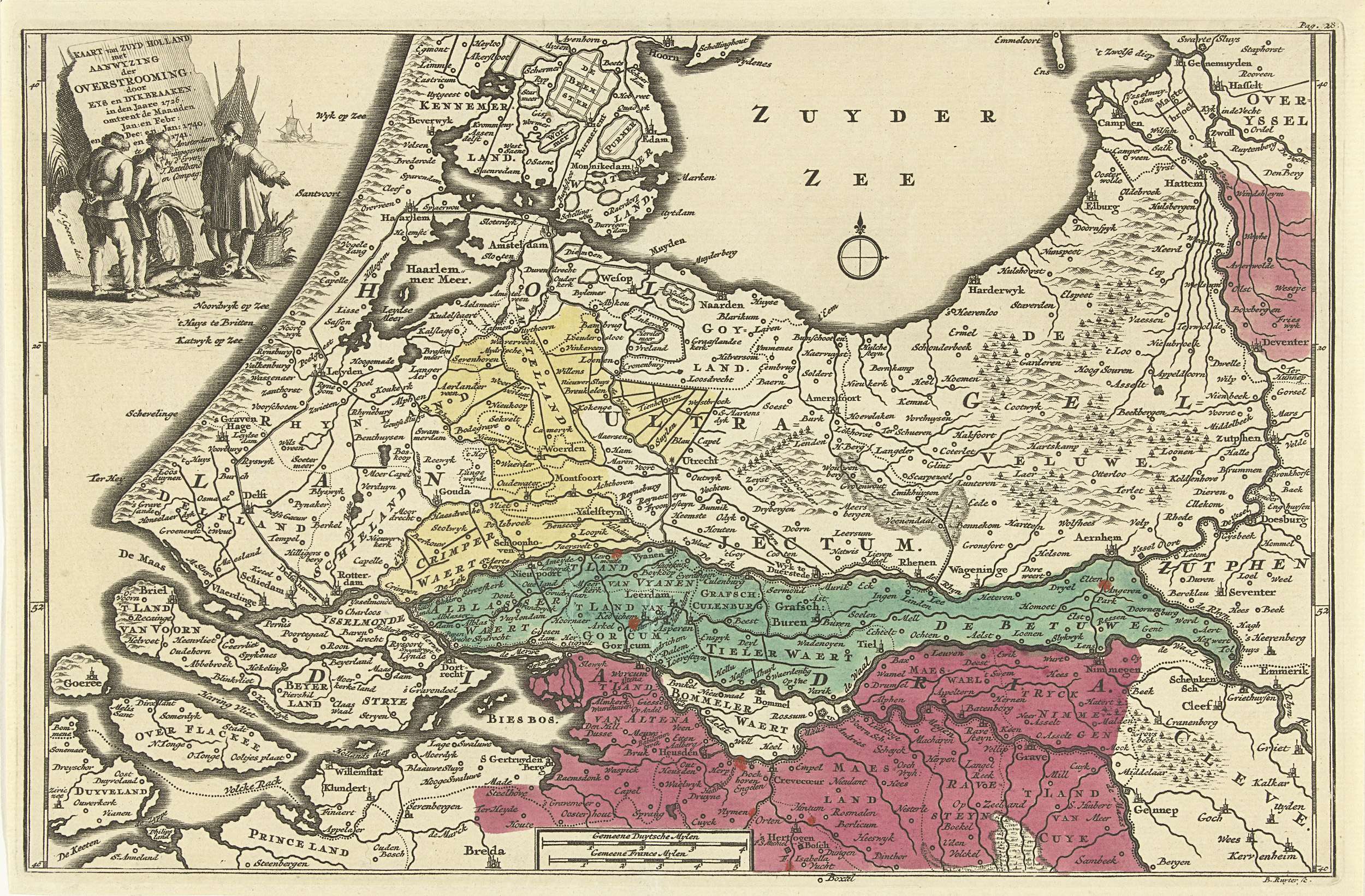 Kaart van Zuid-Holland waarop zijn aangegeven de overstromingen in de jaren 1726 en 1740-1741, met gedrukte verklaring