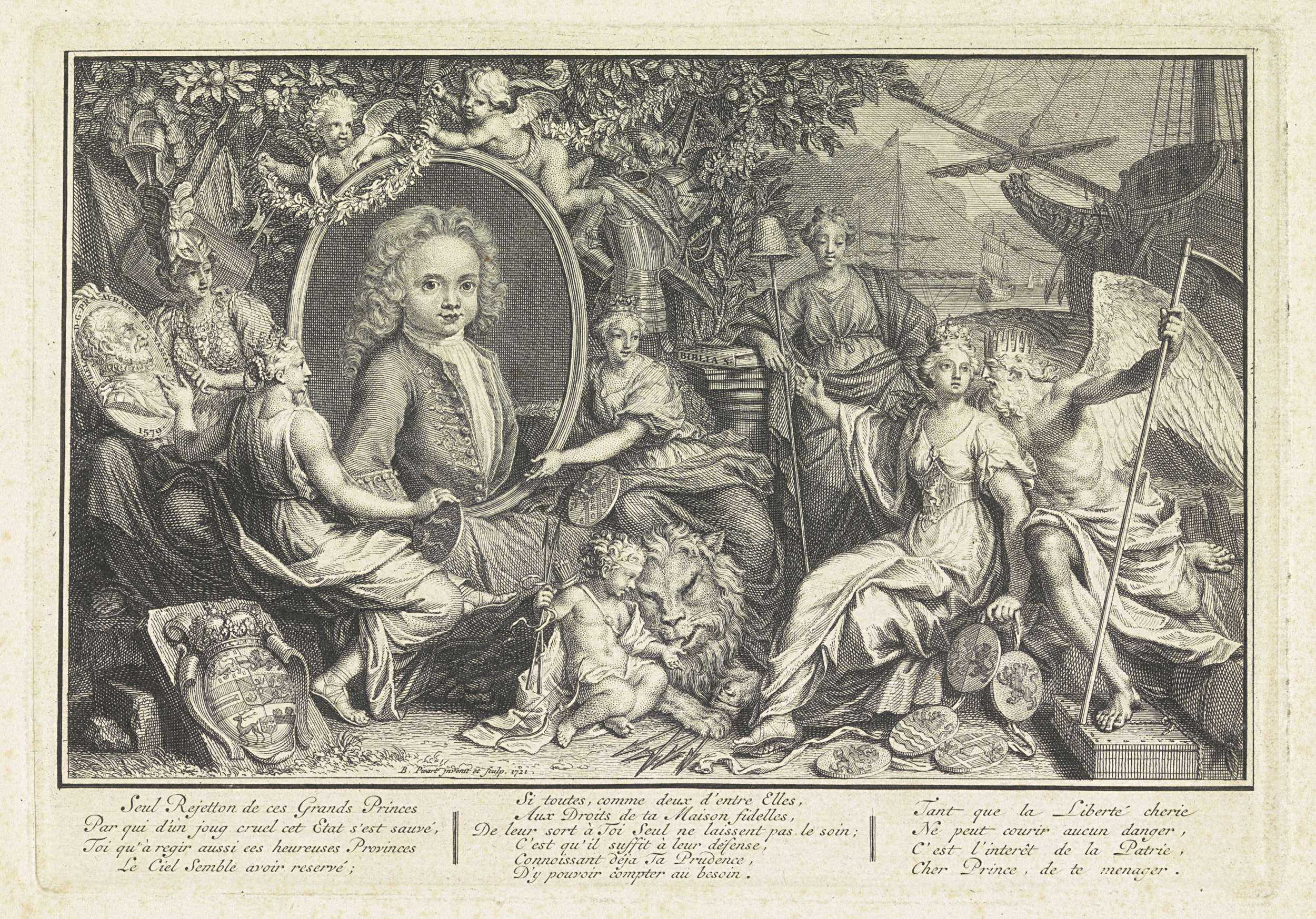 Portret van Willem IV in een ovaal. Daar omheen meerdere allegorische figuren en objecten, waaronder twee provinciemaagden van Friesland en Groningen, de Tijd en de Nederlandse Maagd. Links Minerva met een portret van Willem I. In de ondermarge drie kolommen met veertien regels Franse tekst.