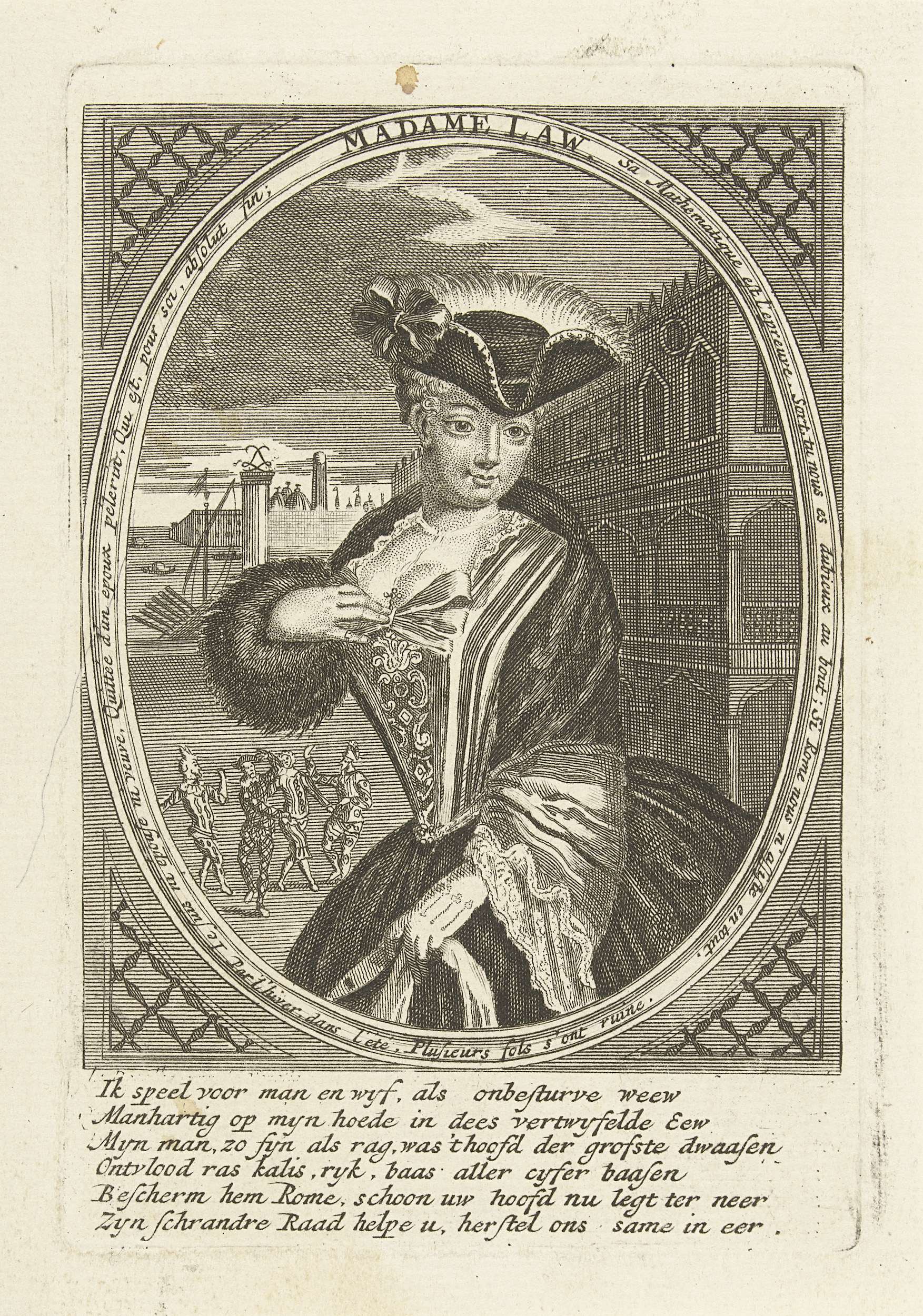 Ovaal portret van madame Law, ca. 1720. Halffiguur staande voor het Sint-Marcoplein in Venetië, in de verte enkele dansende carnavalsvierders. Met randschrift in het Frans en onder het portret een zesregelig vers in het Nederlands. Behoort tot de groep van prenten toegevoegd aan de serie Tafereel der Dwaasheid met spotprenten op de Windhandel of Actiehandel ...