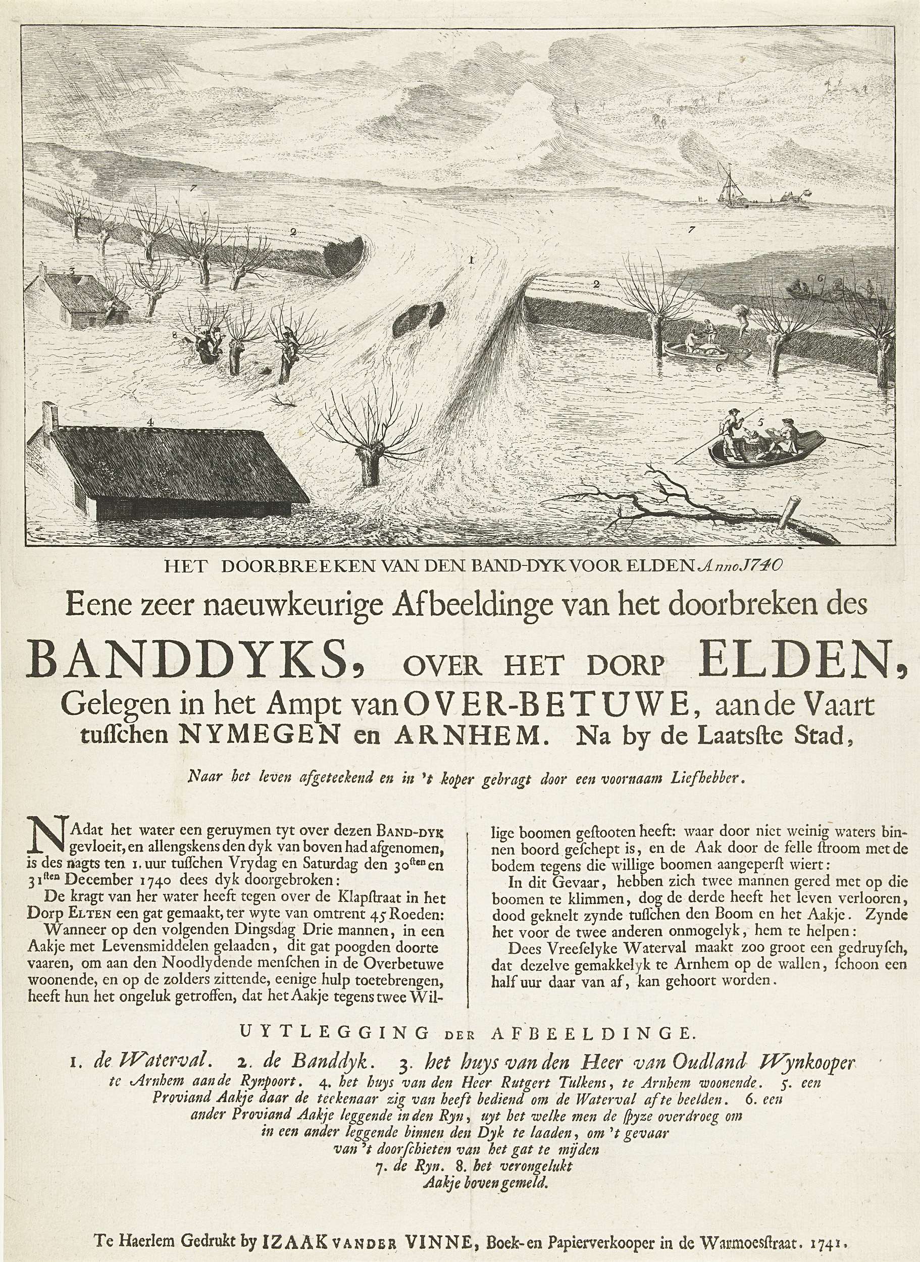 Watersnood bij het doorbreken van de dijk bij het dorp Elden, in de nacht van 30 op 31 december 1740. Rechts de tekenaar tekenend in een bootje op het water. Op het blad onder de plaat een beschrijving van de gebeurtenissen en de legenda 1-8.