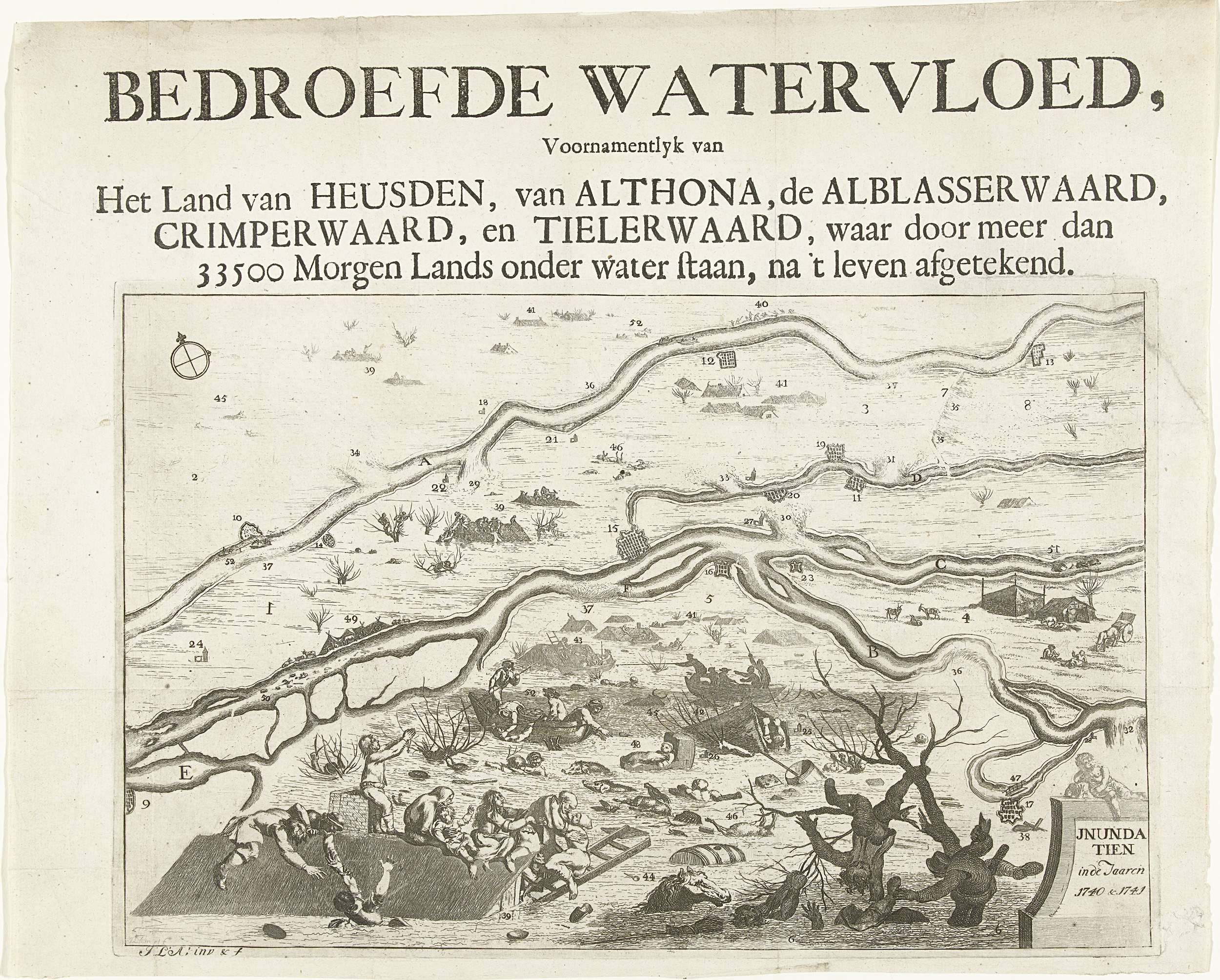 Kaart van het gebied getroffen door de watersnood na het doorbreken van de dijk bij het dorp Elden, 1740 en 1741. Op de voorgrond zoeken mensen redding in bomen en op het dak van een boerderij, meer naar achteren worden mensen uit het water getrokken in bootjes.