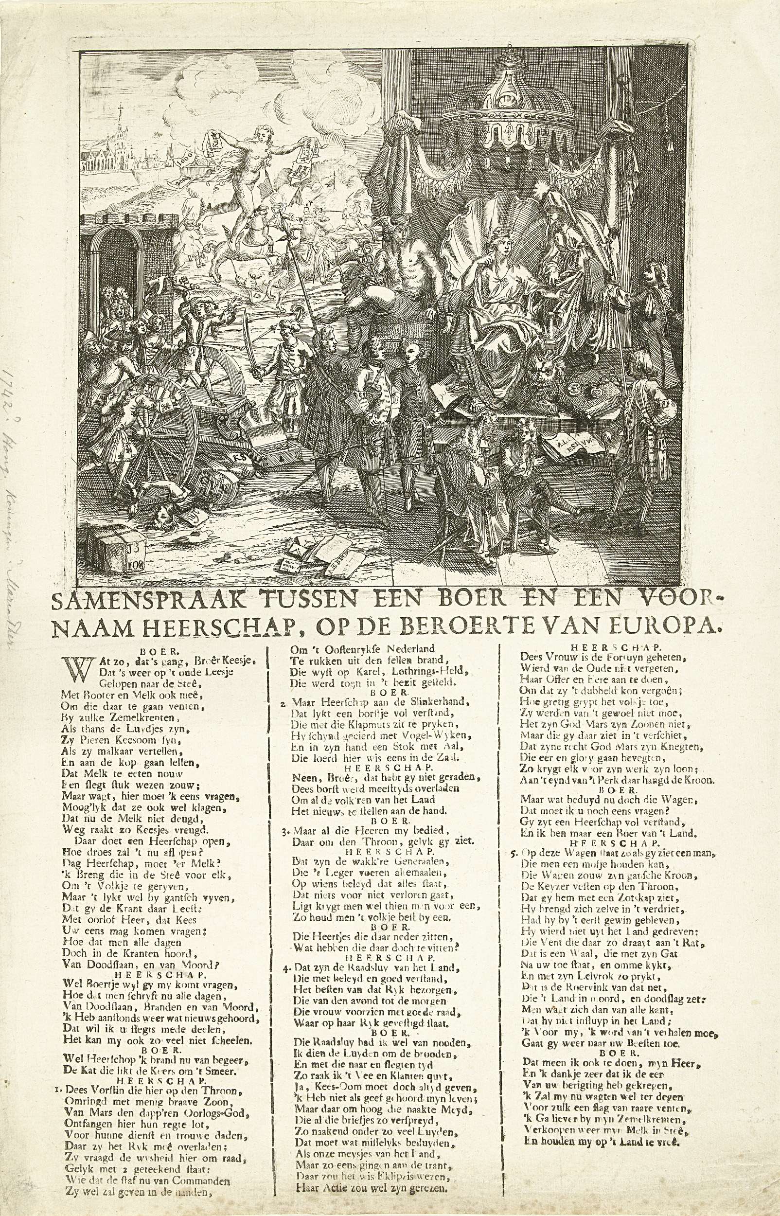 Aartshertogin Maria Theresia vraagt de Waarheid om raad in de strijd om de Duitse keizerskroon. Maria Theresia gezeten op haar troon, links Mercurius, rechts de Waarheid. Voor de troon de mogelijke kandidaten voor de keizerskroon, links rijdt Frankrijk de keurvorst van Beieren op een wagen naar voren. Allegorie op de Oostenrijkse successieoorlog. Op het blad ...