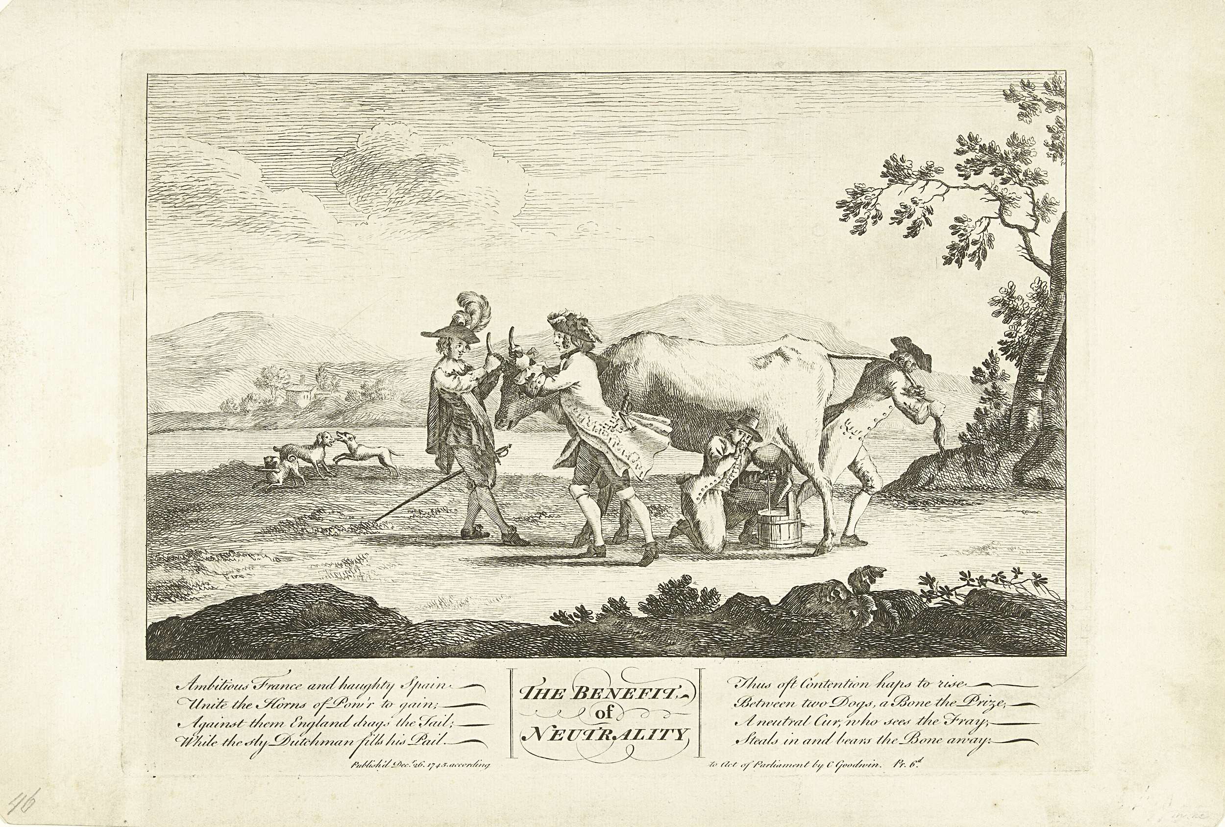 Het voordeel van de Hollandse neutraliteit, 1742-1745. Allegorie op de Oostenrijkse successieoorlog, waarin de strijdende partijen Engeland, Frankrijk en Spanje vechten om een melkkoe, terwijl de neutrale Hollander haar stiekem melkt. In het onderschrift twee verzen in het Engels, de datum van uitgave en de prijs (6d.).