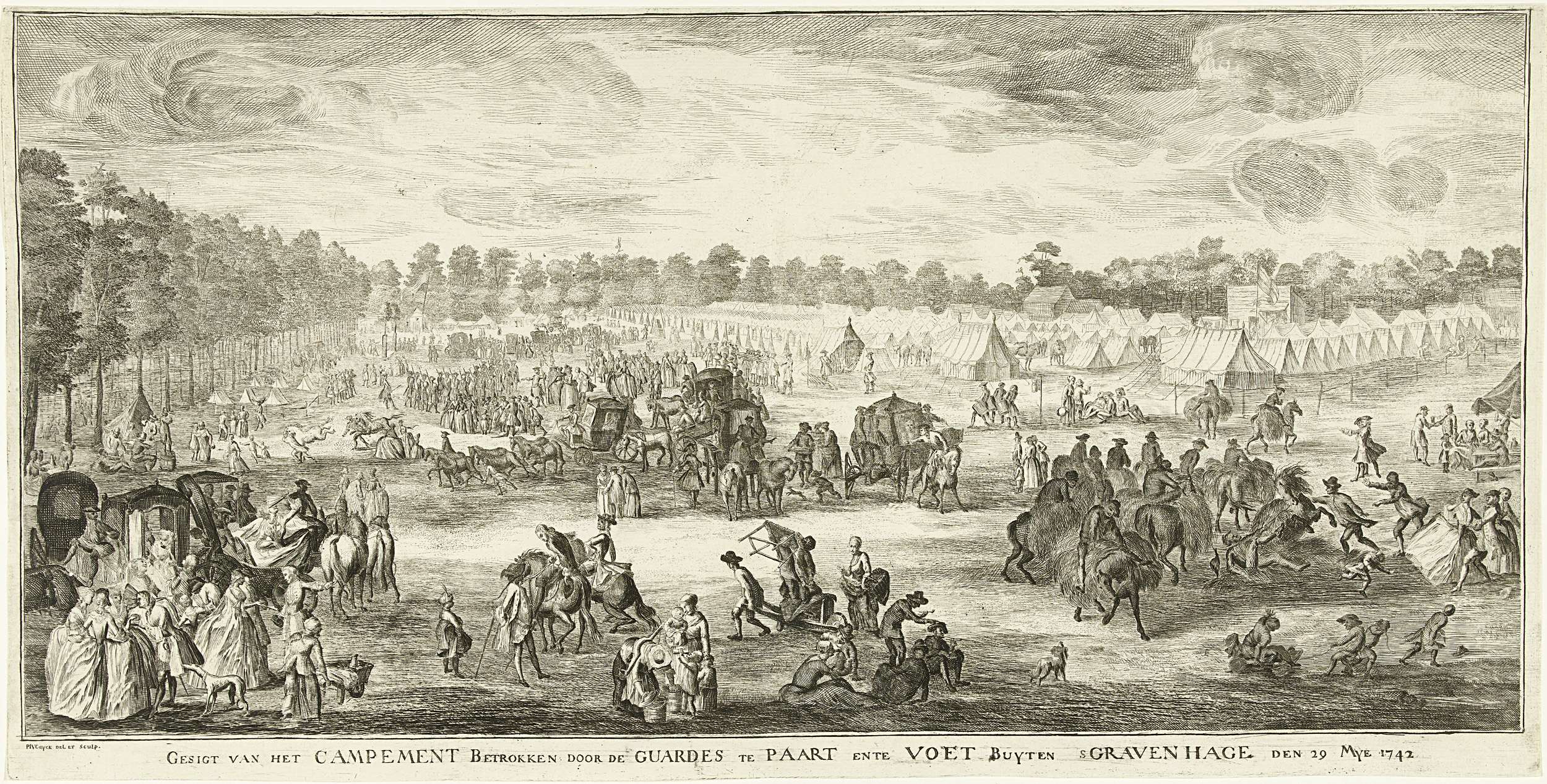 Gezicht op de grote legeroefening het Kampement te Den Haag, een legerkamp opgeslagen op bevel van de Staten van Holland en West-Friesland in het Haagse Bos bij Den Haag, 29 mei 1742.