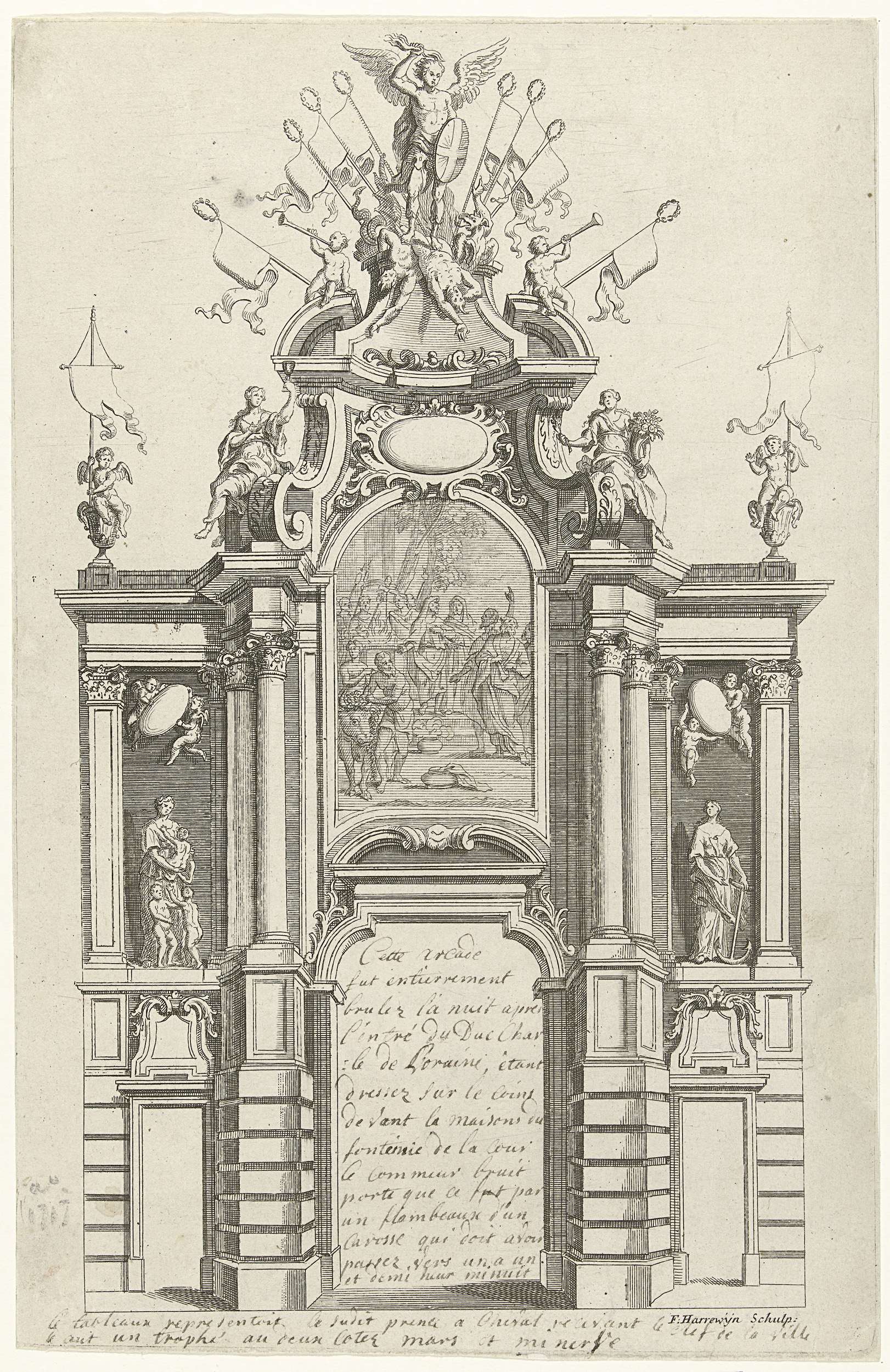 Triomfpoort opgericht bij de intocht van landvoogd Karel Alexander van Lotharingen (Karel van Lorreinen) en zijn vrouw (landvoogdes)Maria Anna van Oostenrijk, te Brussel, 26 maart 1744. Met opschriften in pen. Volgens het opschrift is de poort de nacht na de intocht geheel afgebrand.