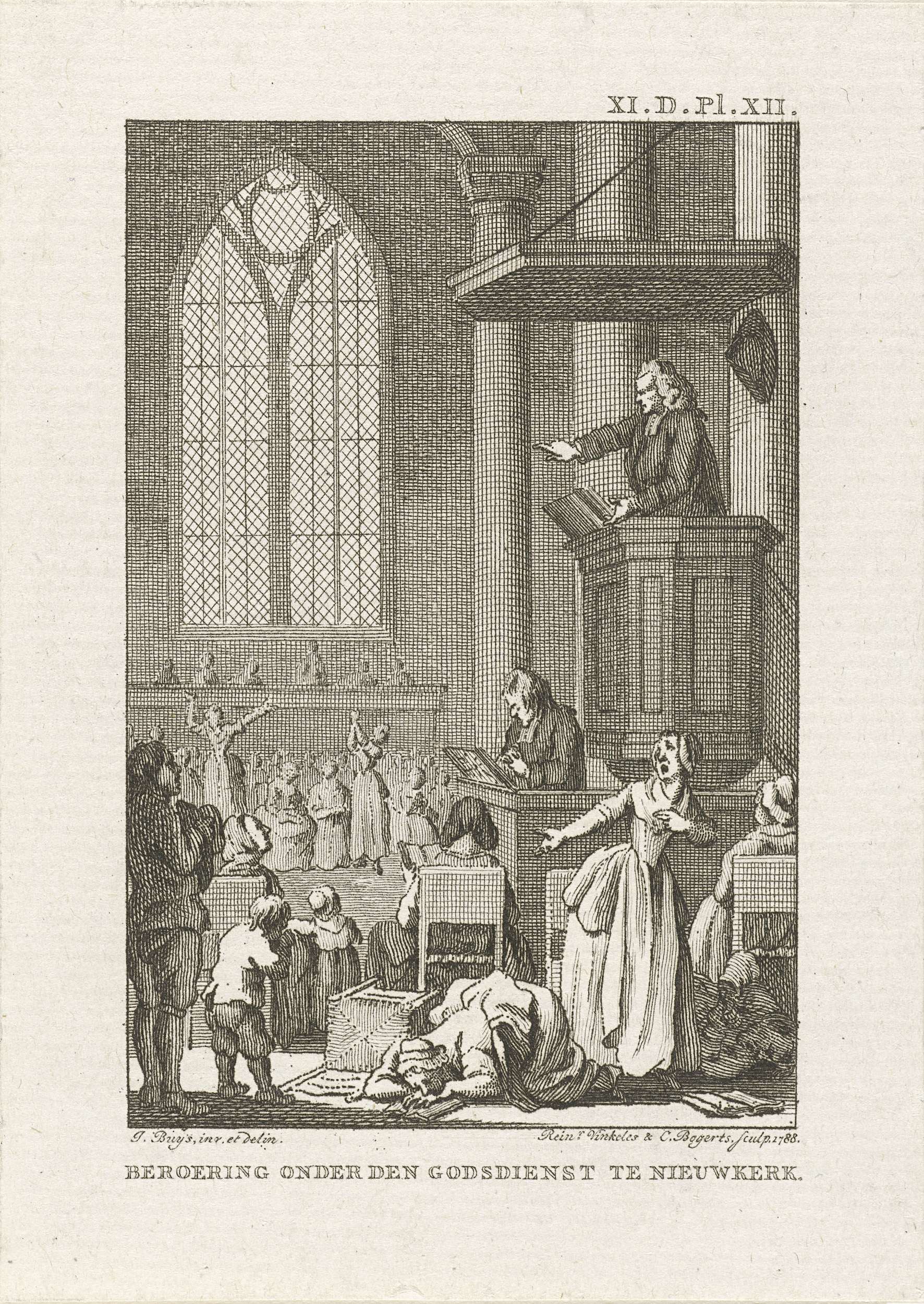 Nijkerkse Beroeringen. Onrust onder de kerkbezoekers tijdens het preken van ds. Gerardus Kuijpers te Nijkerk (Nieuwkerk), 1749. Gemerkt rechtsboven: XI Dl. Pl. XII.