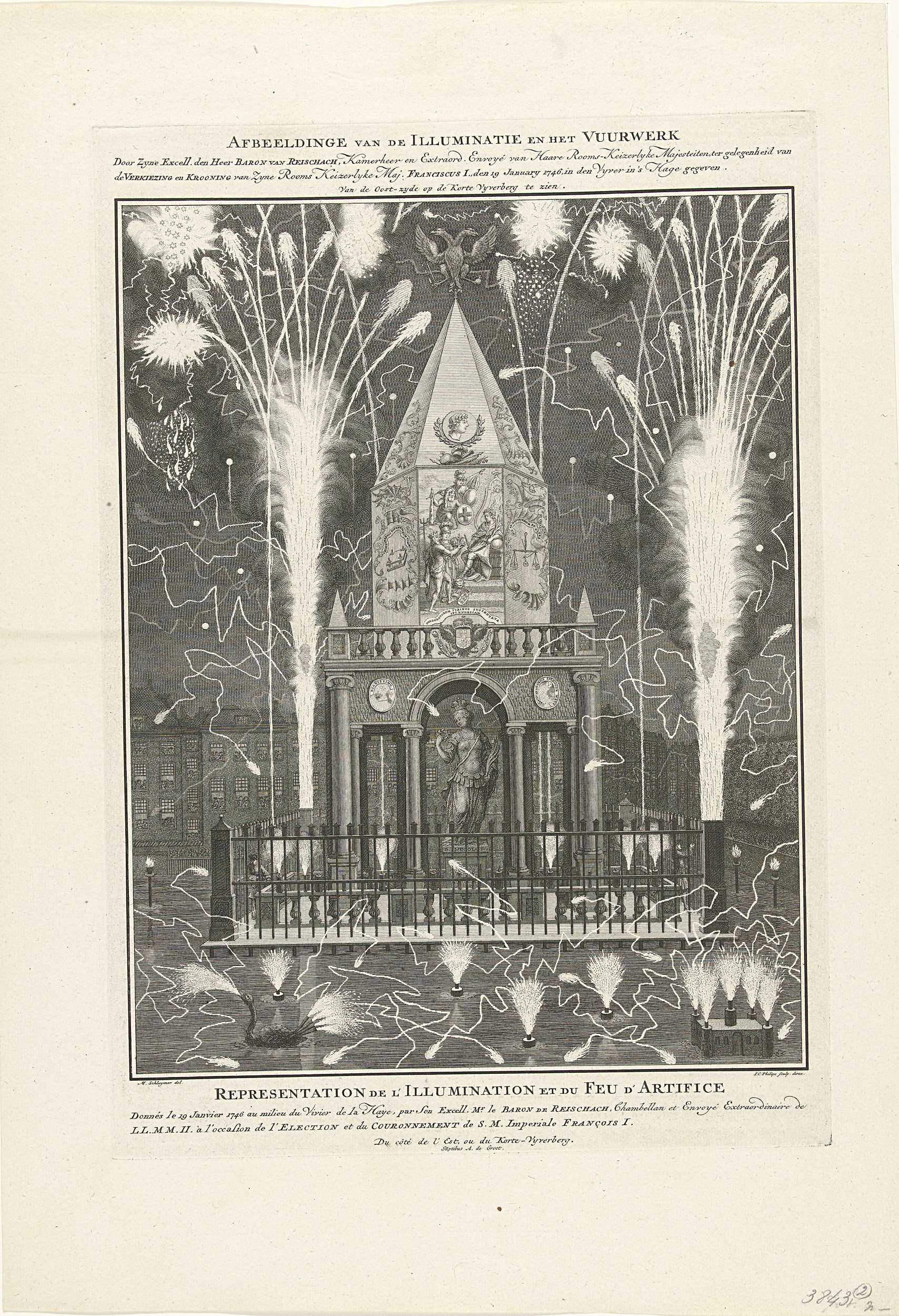Vuurwerk afgestoken op 19 januari 1746 op de Hofvijver te Den Haag in opdracht van de Duitse minister en afgezant baron van Reischach ter gelegenheid van de kroning van Frans I Stefan tot keizer op 4-6 oktober 1745.