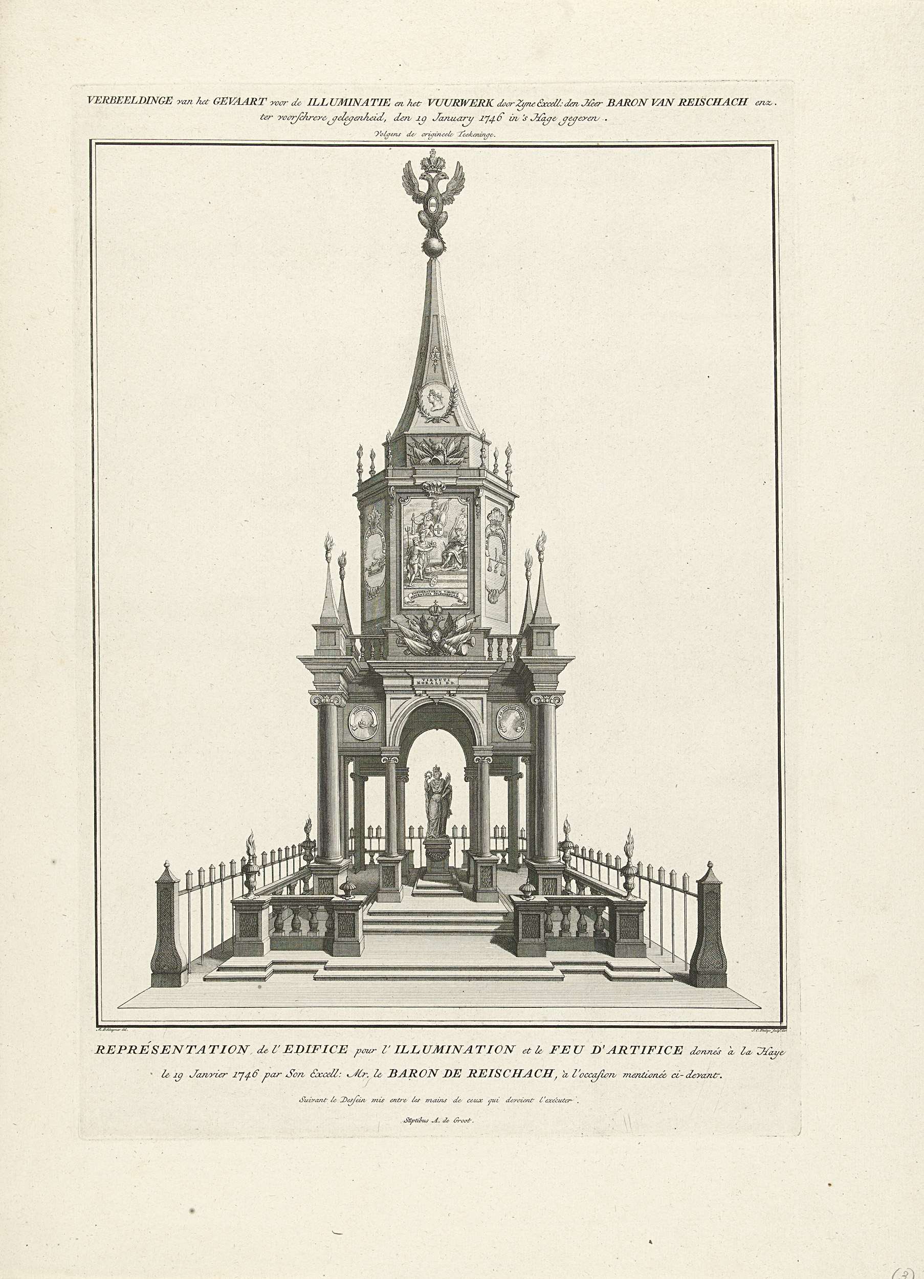 Het bouwwerk (tempel of gevaarte) voor het vuurwerk afgestoken op 19 januari 1746 op de Hofvijver te Den Haag in opdracht van de Duitse minister en afgezant baron van Reischach ter gelegenheid van de kroning van Frans I Stefan tot keizer op 4-6 oktober 1745.