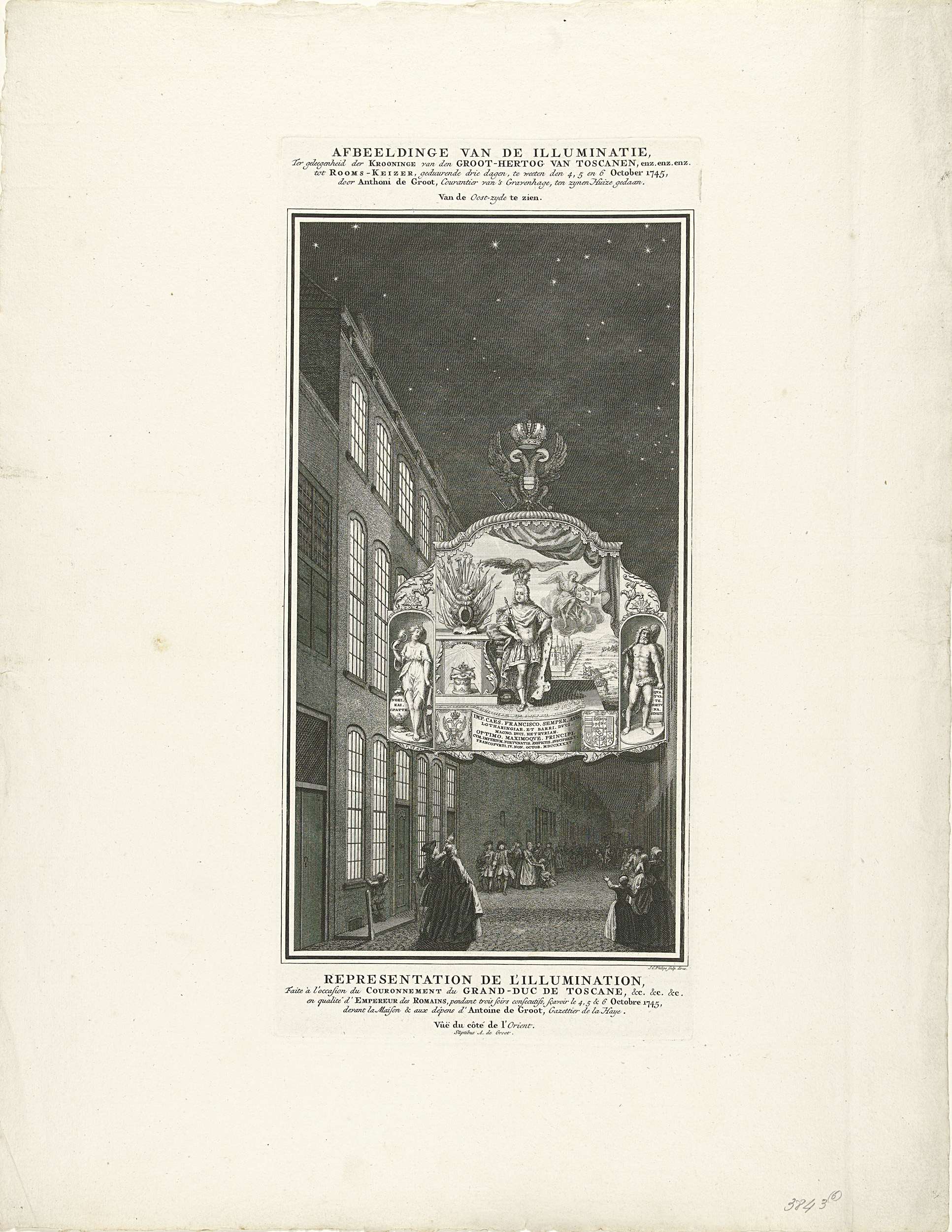 Illuminatie ter gelegenheid van de kroning van Frans I Stefan tot keizer, op 4-6 oktober 1745 opgericht voor het huis van uitgever Anthoni de Groot te Den Haag, gezien vanuit de oostzijde. Een groot verlicht bord hangend over de straat met een portret van de keizer.