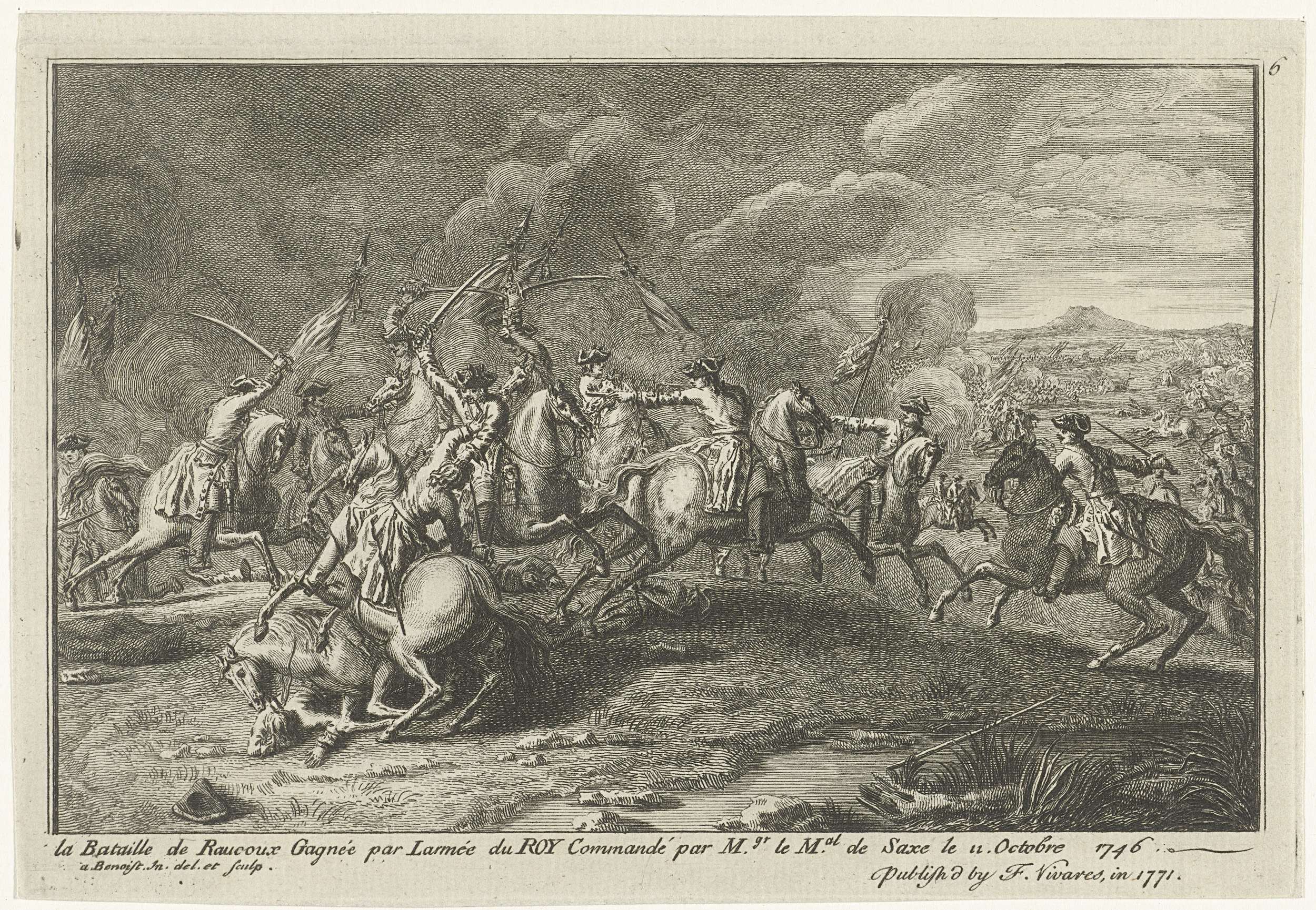 Gezicht op de slag bij Rocourt (Raucoux) bij Luik op 11 oktober 1746 waarbij het Franse leger onder maarschalk Moritz, Graf von Sachsen de Geallieerden versloeg. Genummerd rechtsboven: 6.