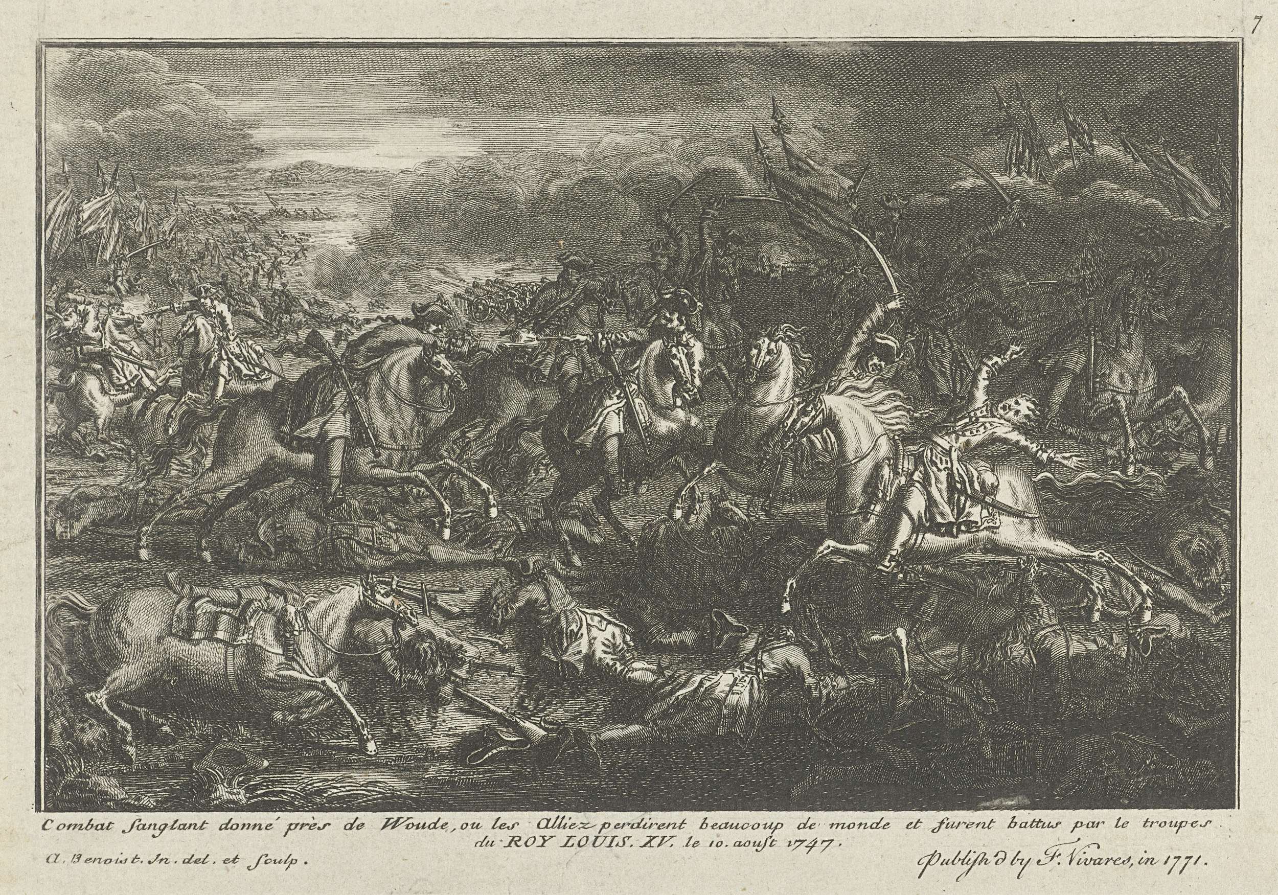 Gezicht op de slag bij Wouw (bij Bergen op Zoom) op 10 augustus 1747 waarbij het Franse leger de Geallieerden versloeg. Genummerd rechtsboven: 7.