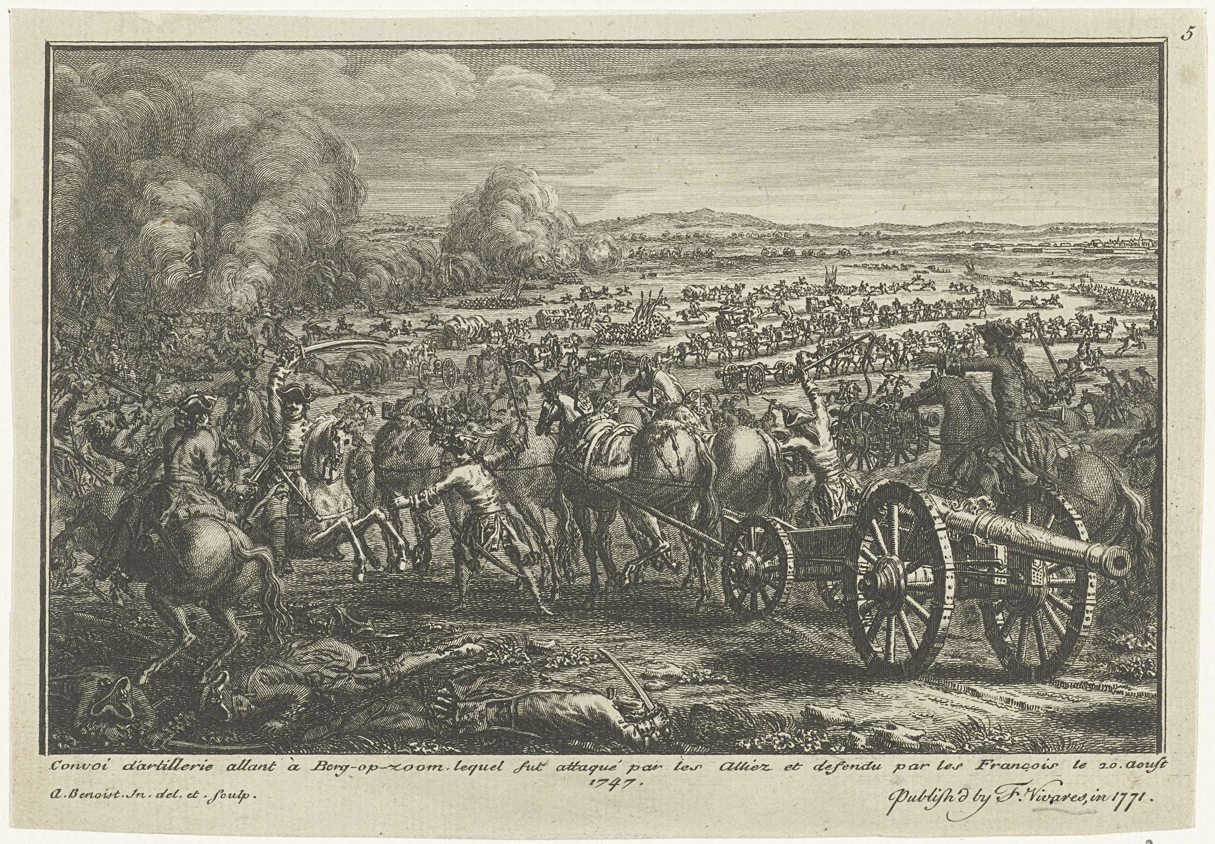 Aanval van Geallieerde troepen op een artillerietransport van het Franse leger op weg naar Bergen op Zoom, 20 augustus 1747. Genummerd rechtsboven: 5.