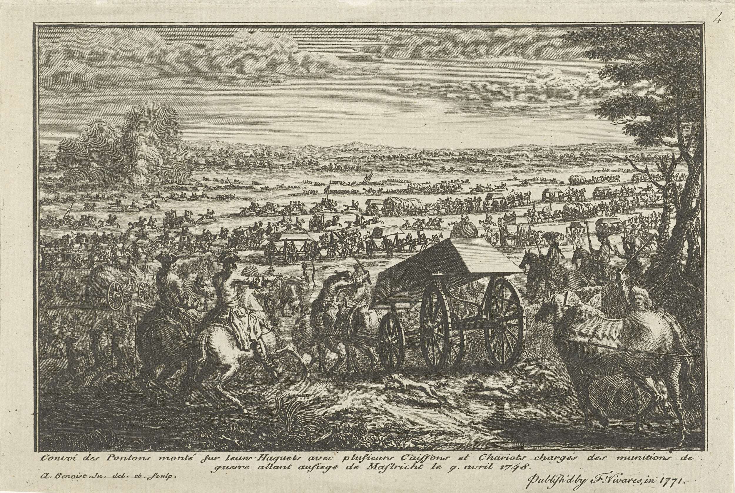 Een Frans legertransport met boten op weg naar het beleg van Maastricht, 9 april 1748. Genummerd rechtsboven: 4.