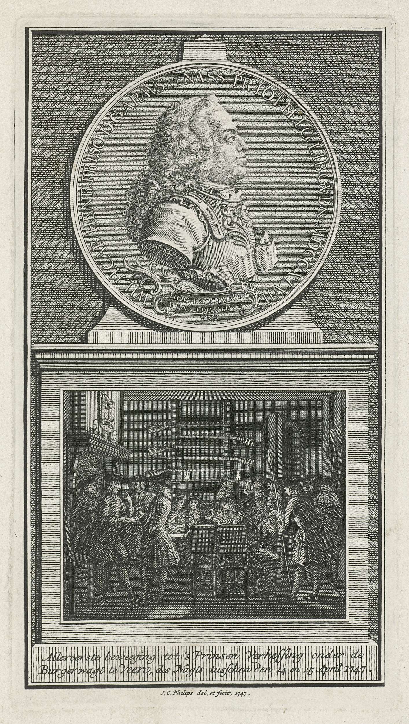 Eerste initiatieven tot de verheffing van Willem IV tot stadhouder van Zeeland onder de burgerwacht te Veere, in de nacht van 24 op 25 april 1747. Wachtlokaal waarin leden van de schutterij beraadslagen. Bovenaan een medaillon met het portret van prins Willem IV.