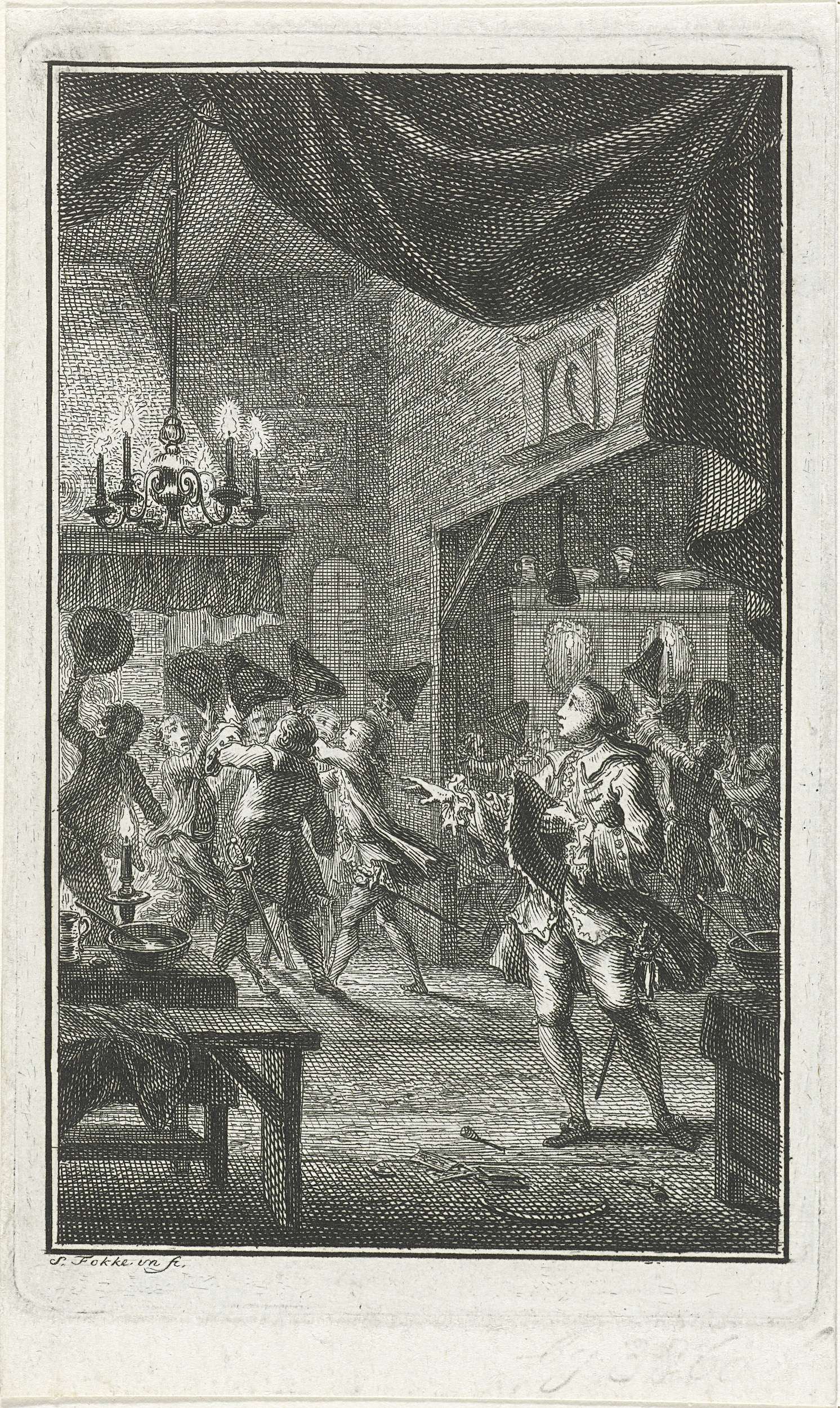 Eerste initiatieven tot de verheffing van Willem IV tot stadhouder van Zeeland onder de burgerwacht te Veere, in de nacht van 24 op 25 april 1747. Interieur waarin leden van de schutterij elkaar omhelzen en hun hoeden in de lucht gooien.