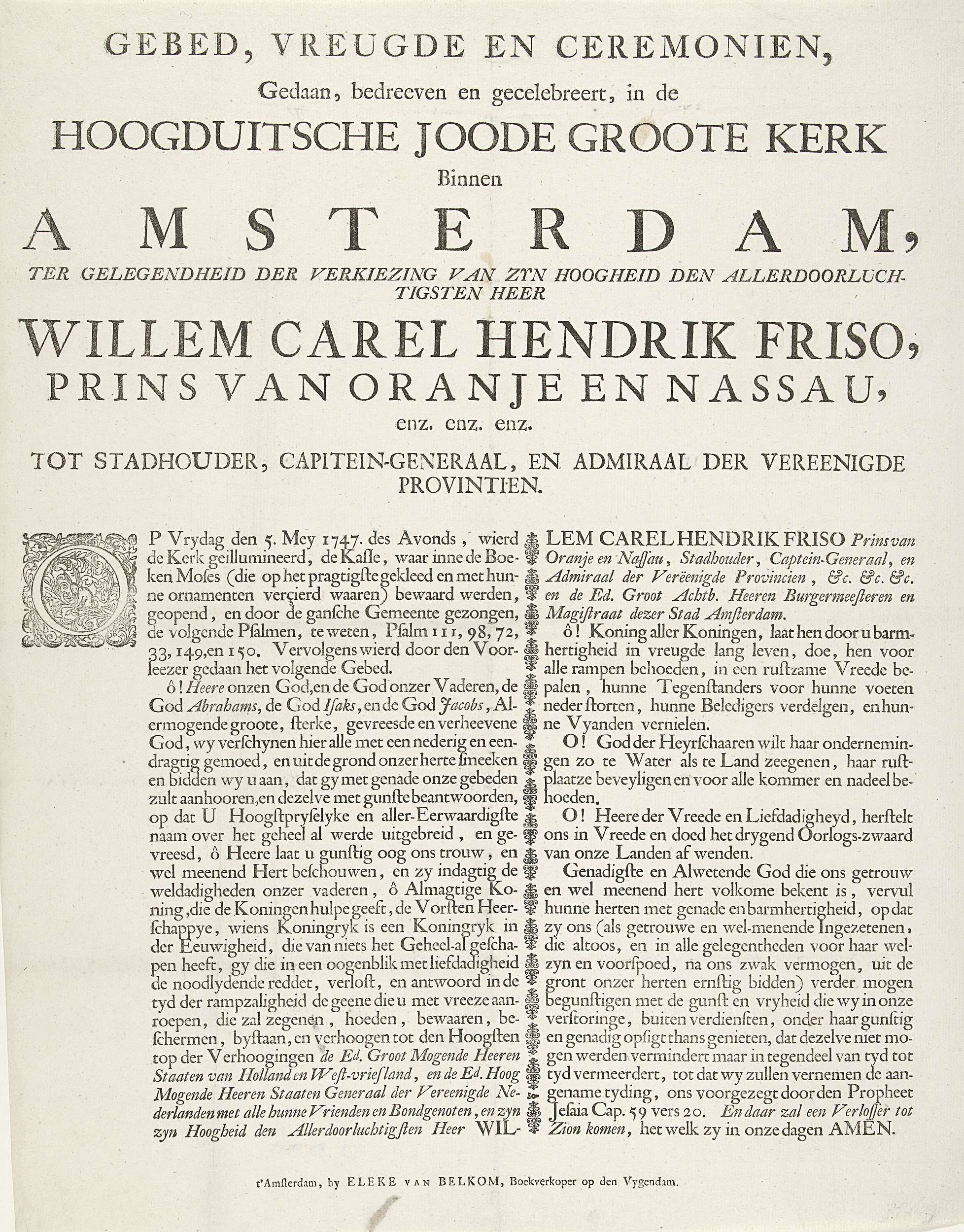 Tekstblad met het gebed uitgesproken in de Hoogduitse Synagoge te Amsterdam bij de benoeming van Prins Willem IV als stadhouder van Holland, 5 Mei 1747.
