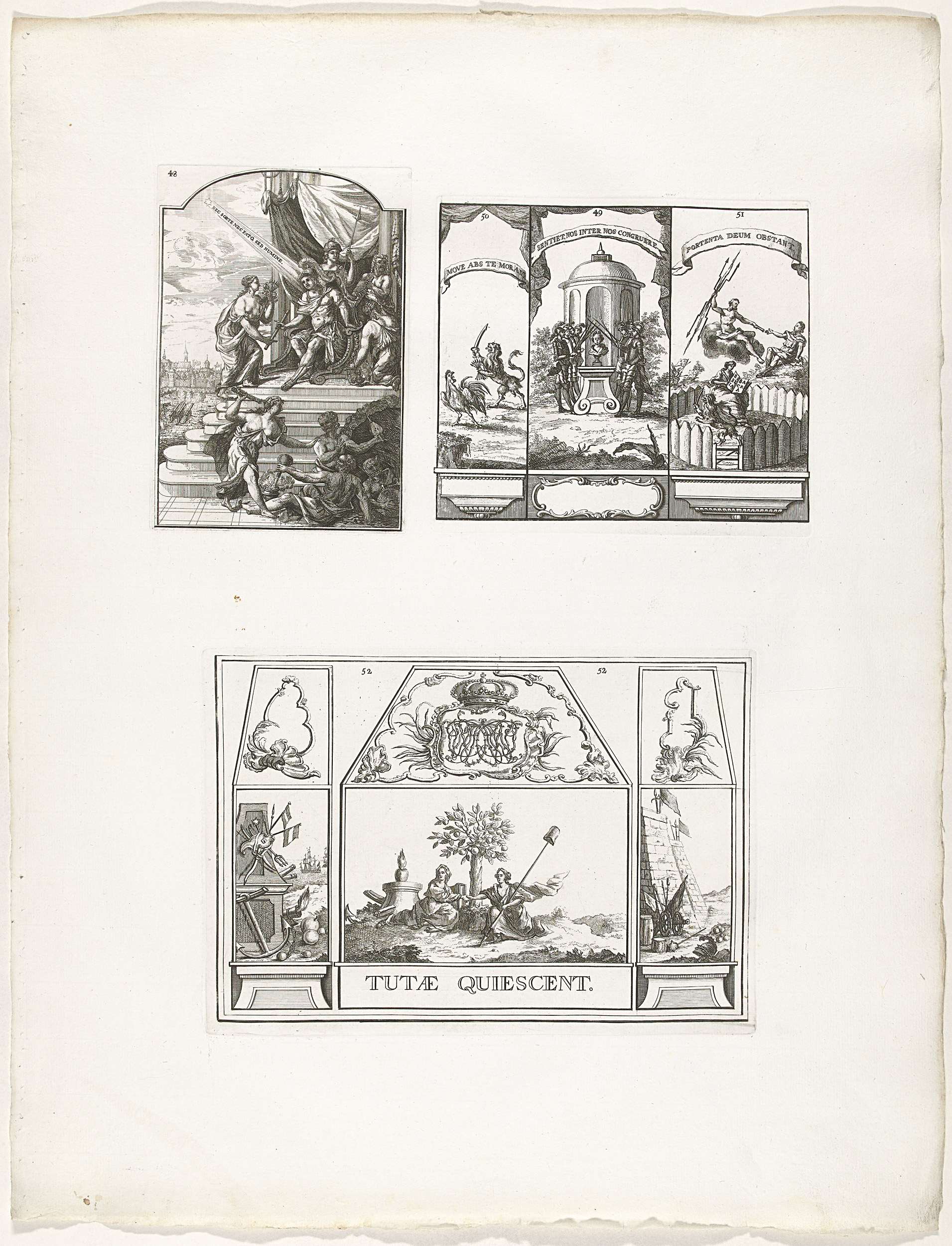 Blad met de decoraties aangeduid met de cijfers 48-52, opgehangen aan de huizen van inwoners van Den Haag. Los blad oorspronkelijk onderdeel van het plaatwerk Haga comitis illustrata uit 1751 met de versieringen opgesteld te Den Haag tijdens de feestelijkheden rond de installatie van prins Willem IV als stadhouder van Holland en West-Friesland op 3 ...
