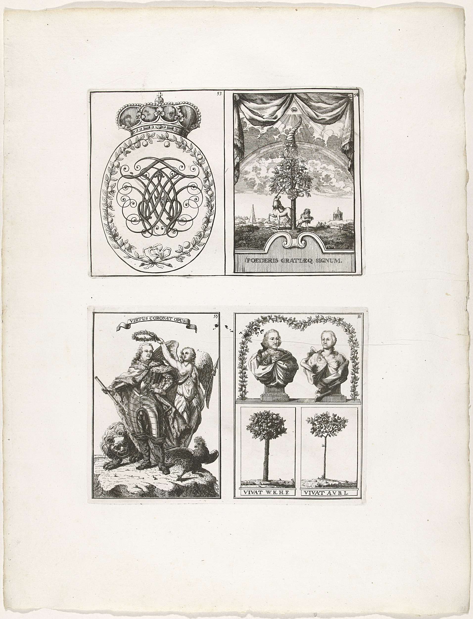 Blad met de decoraties aangeduid met de cijfers 53-56, opgehangen aan de huizen van inwoners van Den Haag. Los blad oorspronkelijk onderdeel van het plaatwerk Haga comitis illustrata uit 1751 met de versieringen opgesteld te Den Haag tijdens de feestelijkheden rond de installatie van prins Willem IV als stadhouder van Holland en West-Friesland op 3 ...
