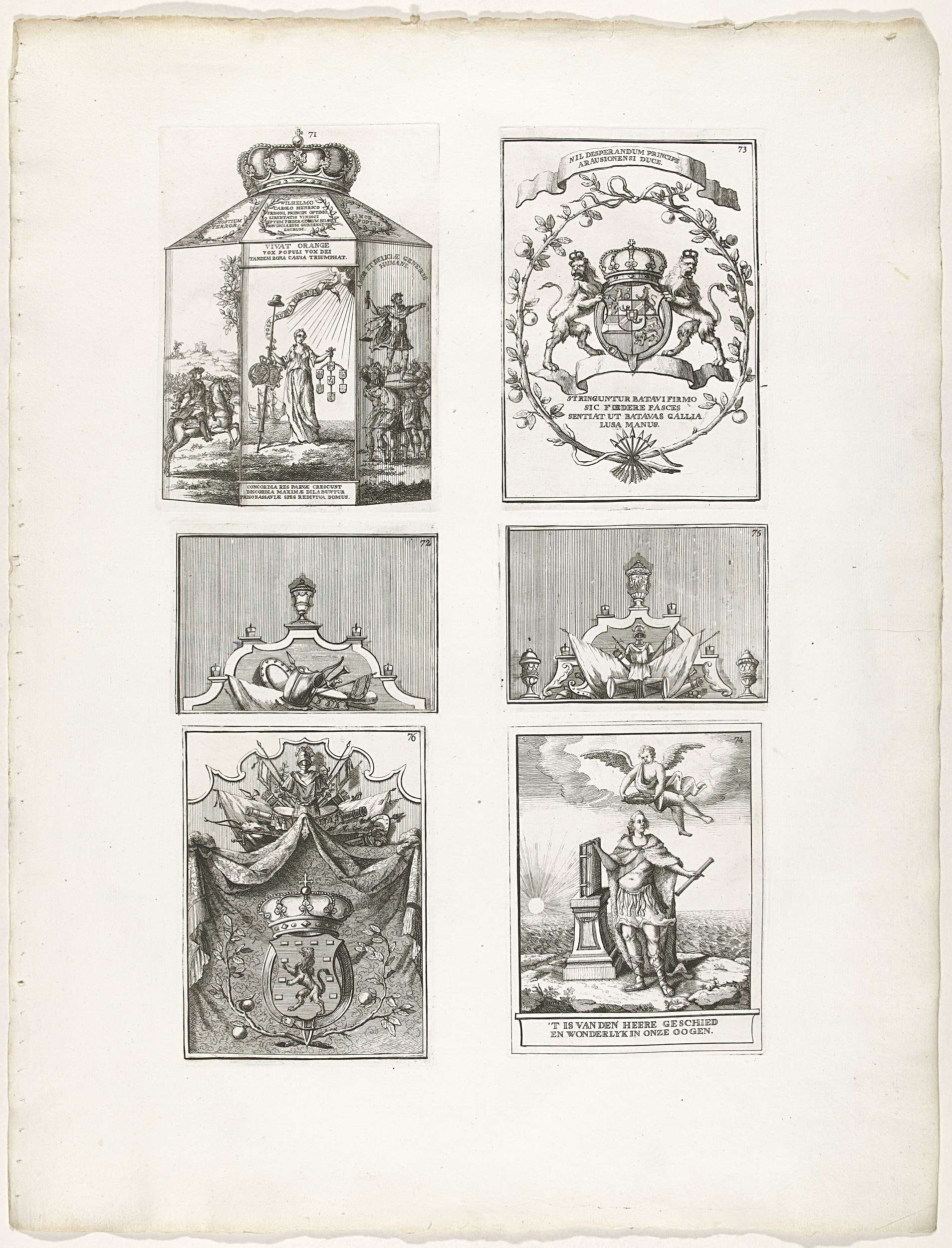 Blad met de decoraties aangeduid met de cijfers 71-76, opgehangen aan de huizen van inwoners van Den Haag. Los blad oorspronkelijk onderdeel van het plaatwerk Haga comitis illustrata uit 1751 met de versieringen opgesteld te Den Haag tijdens de feestelijkheden rond de installatie van prins Willem IV als stadhouder van Holland en West-Friesland op 3 ...
