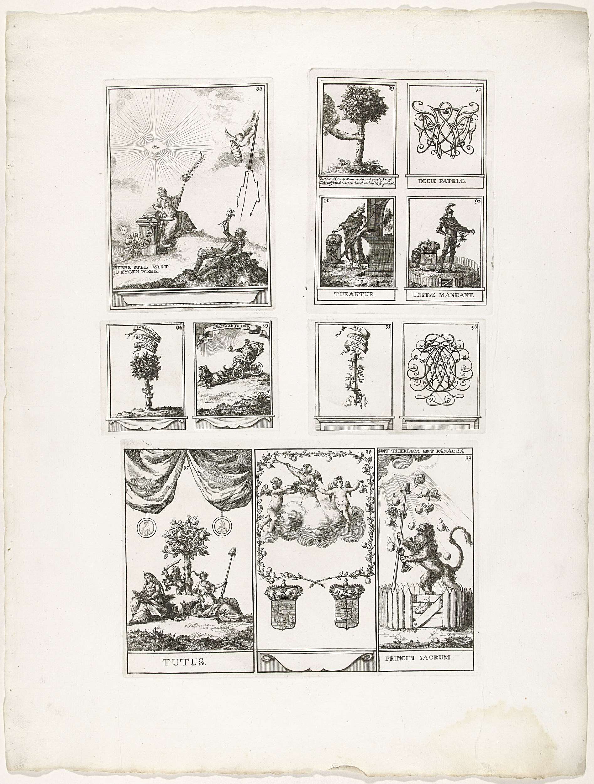 Blad met de decoraties aangeduid met de cijfers 88-99, opgehangen aan de huizen van inwoners van Den Haag. Los blad oorspronkelijk onderdeel van het plaatwerk Haga comitis illustrata uit 1751 met de versieringen opgesteld te Den Haag tijdens de feestelijkheden rond de installatie van prins Willem IV als stadhouder van Holland en West-Friesland op 3 ...