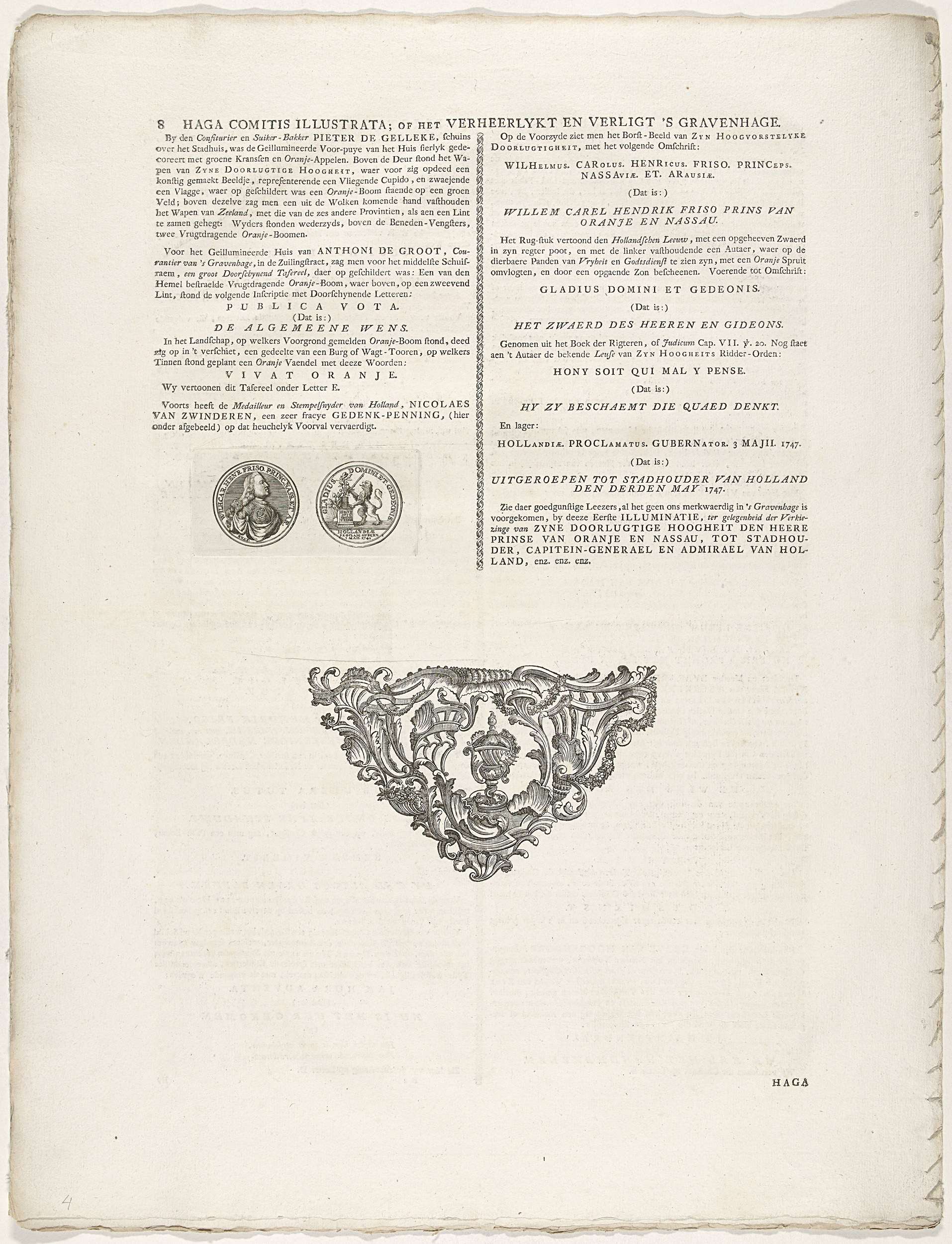Laatste tekstblad in het eerste tekstdeel met tekst in twee kolommen, een voorstelling van een penning op de stadhouder en onderaan een vignet met een vaas tussen rocailles. Los blad oorspronkelijk onderdeel van het plaatwerk Haga comitis illustrata uit 1751 met de versieringen opgesteld te Den Haag tijdens de feestelijkheden rond de installatie van prins ...
