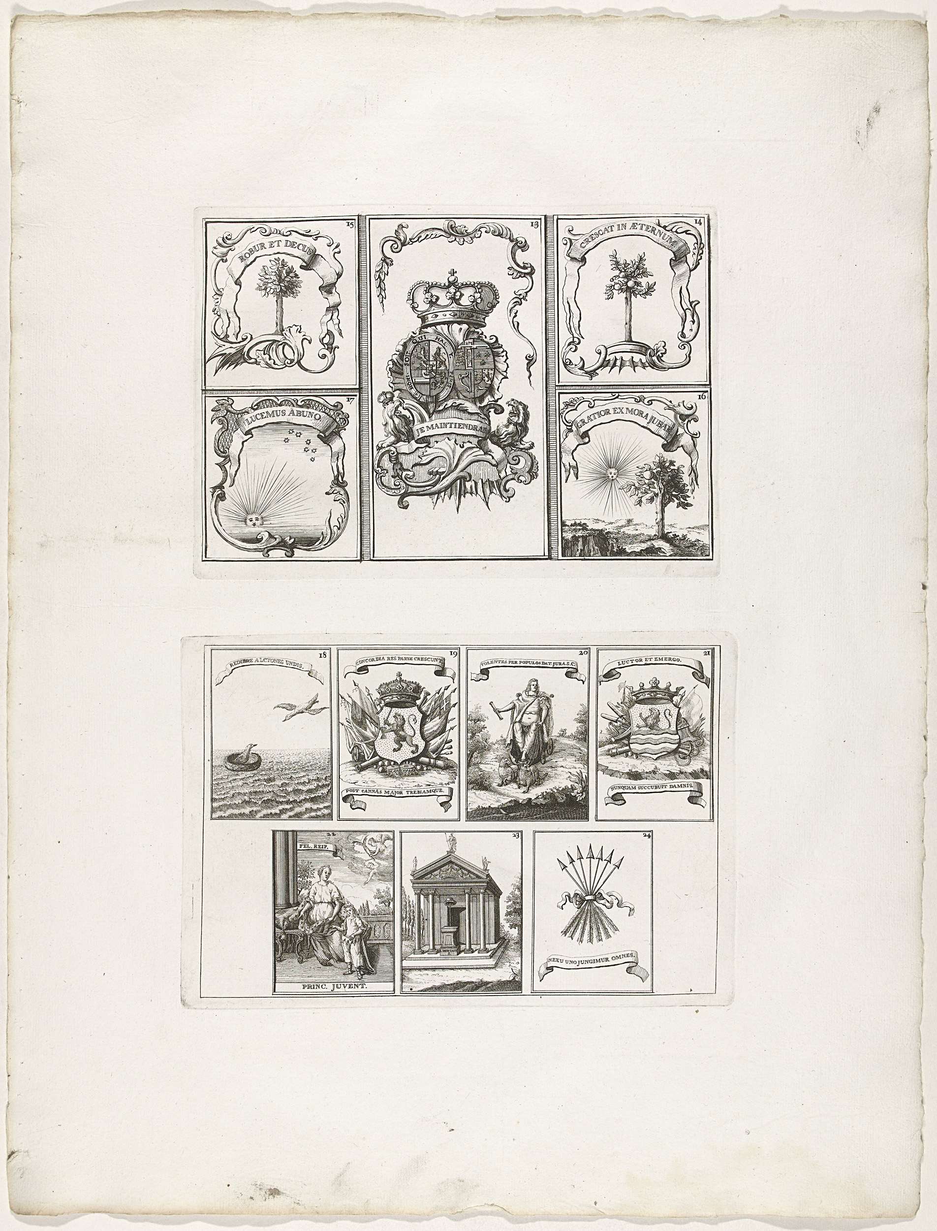 Blad met de decoraties aangeduid met de cijfers 13-24, opgehangen aan de huizen van inwoners van Den Haag. Los blad oorspronkelijk onderdeel van het plaatwerk Haga comitis illustrata uit 1751 met de versieringen opgesteld te Den Haag tijdens de feestelijkheden rond de installatie van prins Willem IV als stadhouder van Holland en West-Friesland op 3 ...