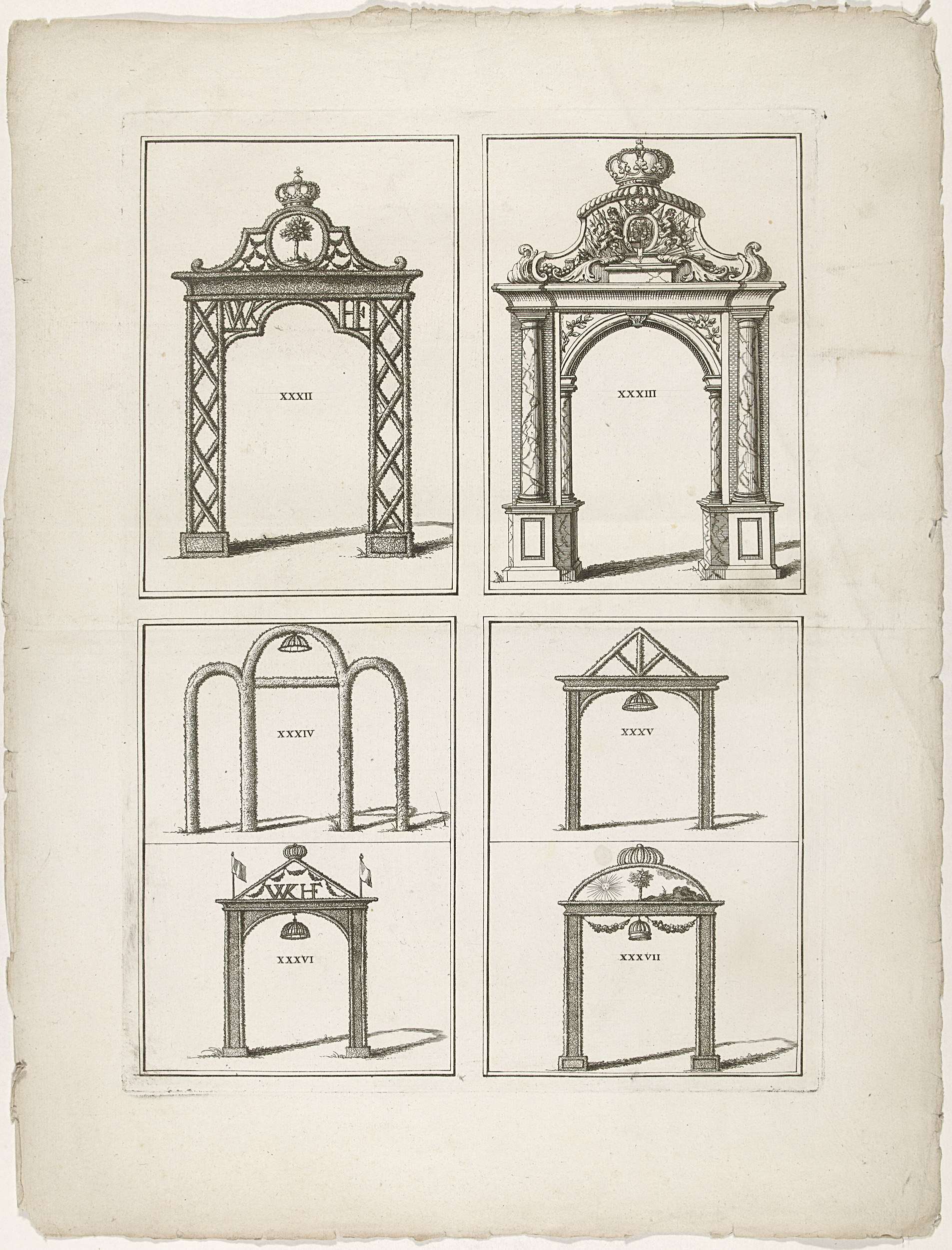 Blad met de erepoorten genummerd XXXII-XXXVII. Los blad oorspronkelijk onderdeel van het plaatwerk Nette afbeelding en ampele beschrijving der eere-poorten uit 1766 met voorstellingen van de erepoorten en triomfbogen opgesteld te Den Haag tijdens de feestelijkheden rond de intrede van prins Willem IV als stadhouder van Holland en West-Friesland op 6 juni 1747.