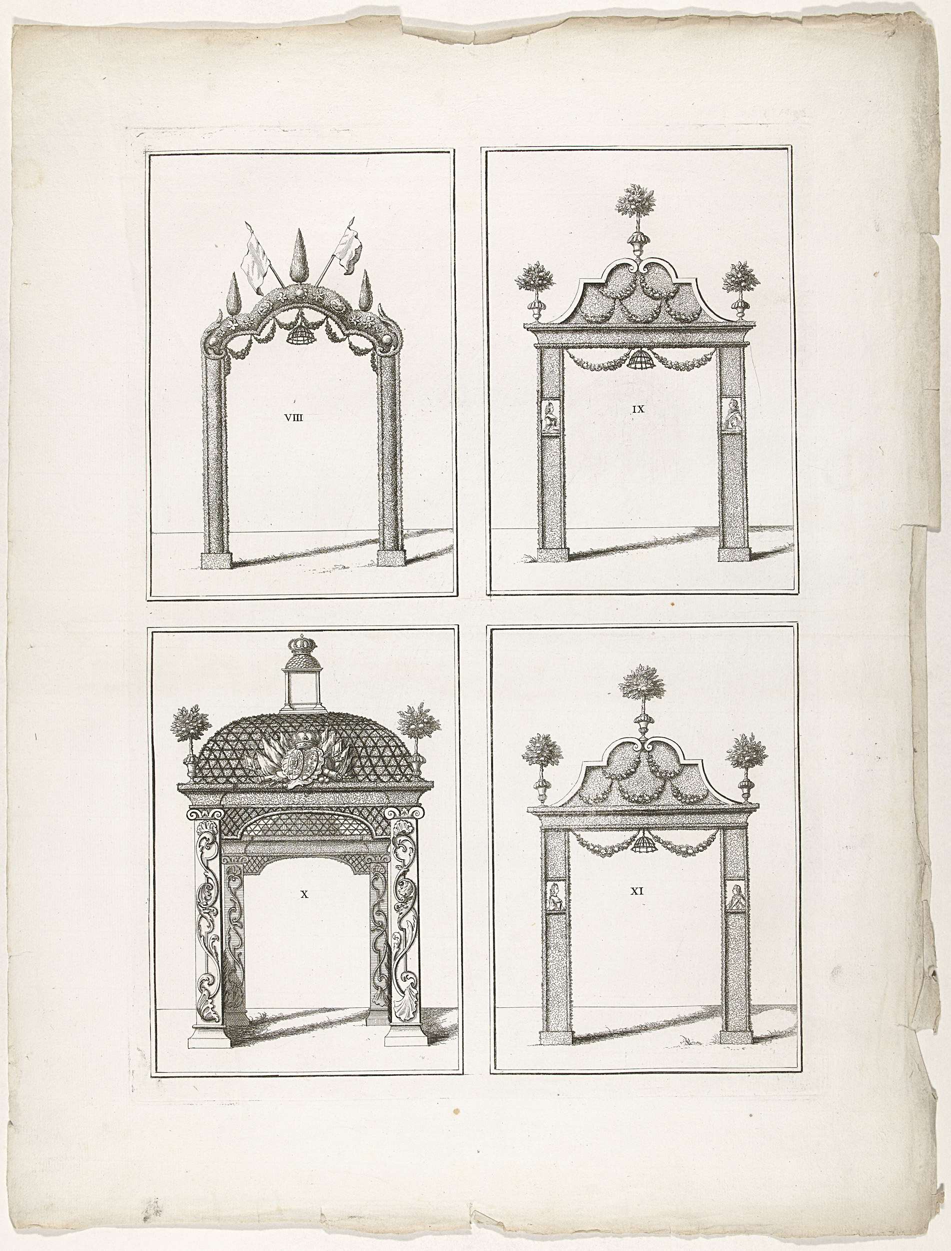 Blad met de erepoorten genummerd VIII-XI. Los blad oorspronkelijk onderdeel van het plaatwerk Nette afbeelding en ampele beschrijving der eere-poorten uit 1766 met voorstellingen van de erepoorten en triomfbogen opgesteld te Den Haag tijdens de feestelijkheden rond de intrede van prins Willem IV als stadhouder van Holland en West-Friesland op 6 juni 1747.