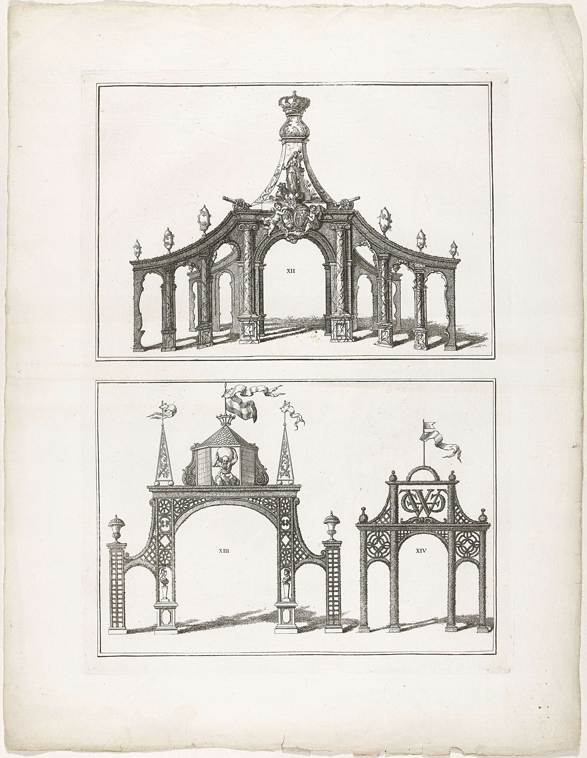 Blad met de erepoorten genummerd XII-XIV. Los blad oorspronkelijk onderdeel van het plaatwerk Nette afbeelding en ampele beschrijving der eere-poorten uit 1766 met voorstellingen van de erepoorten en triomfbogen opgesteld te Den Haag tijdens de feestelijkheden rond de intrede van prins Willem IV als stadhouder van Holland en West-Friesland op 6 juni 1747.