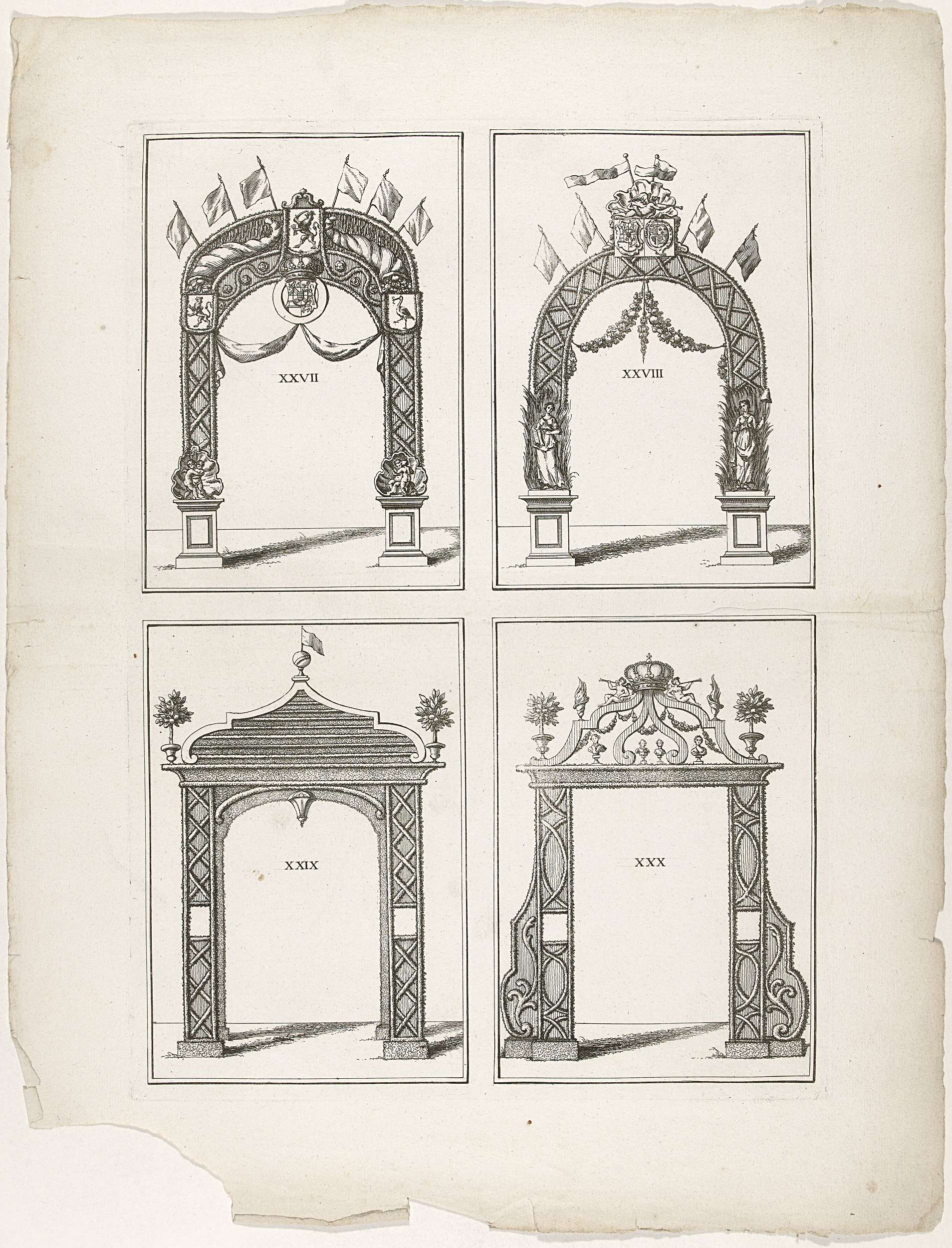 Blad met de erepoorten genummerd XXVII-XXX. Los blad oorspronkelijk onderdeel van het plaatwerk Nette afbeelding en ampele beschrijving der eere-poorten uit 1766 met voorstellingen van de erepoorten en triomfbogen opgesteld te Den Haag tijdens de feestelijkheden rond de intrede van prins Willem IV als stadhouder van Holland en West-Friesland op 6 juni 1747.